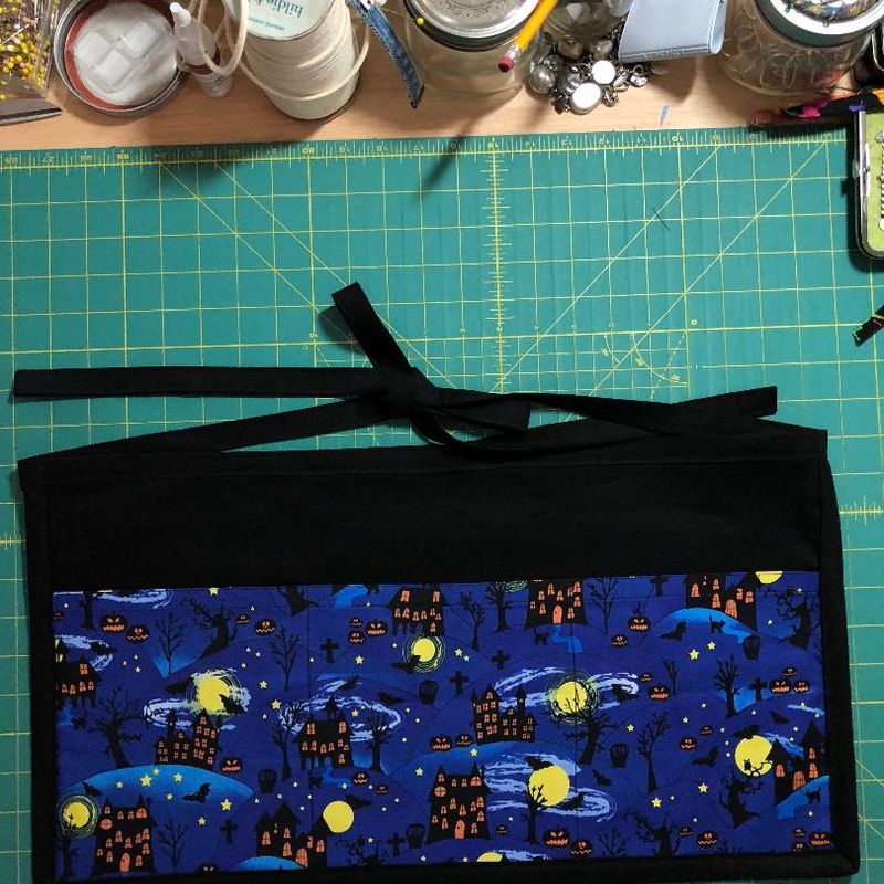 What a really fun way during this Halloween season to serve your customers. This is a cute haunted mansion waist apron, with three pockets to carry all your needs, from cell phone, straws, keys, and even that candy bar! *Aprons are 12 x 21 * Each strap is 32 inches *Pockets are 7.5 inches deep by 7 inches wide * 100% Cotton Fabric If there is something specific you are looking for in an apron, please message me I may have it!!