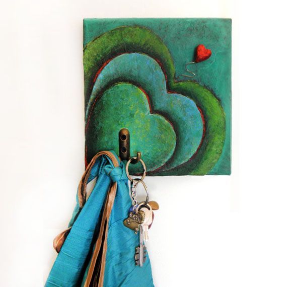 Handmade papier mache key holder with hearts as decor. Three hearts-layers, a little red heart based on a wire and the bright shades of blue, red, green and turquoise make it the perfect object to keep your keys organized. This hanger designed to hold your keys but you can also put lightweight objects like towels or a cloth bag or kids toys. The base of this structure is a square canvas covered with newspaper and glue layers. I also made the three big hearts with the same technique. The little heart is from my handmade paper pulp and based on a silvered wire. This one of a kind key holder is a useful everyday object and a special gift for you or your family or a friend. Perfect also as a wedding or housewarming gift. ITEM MADE TO ORDER ❤ Materials: square canvas, cardboard, newspaper and glue layers, my handmade paper pulp, wire, tissue papers, acrylic colors, satin varnish for protection, triangle hooks, hook for hanging ❤ Dimensions: Size (approx.) of the key holder: Width: 20cm x Height: 20cm x Depth: 2cm (7,9x7,9inx0,8in) ❤ Care: When necessary, please clean it with a dry cloth. No use of any kind of solution. Please handle with care. It’s not a toy so keep it away from children. ♥ All my handmade objects are unique, designed and created by me, Efthimia Kotsanelou