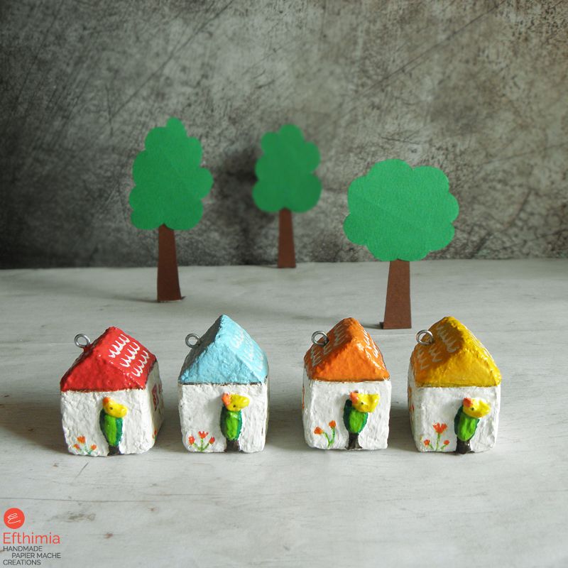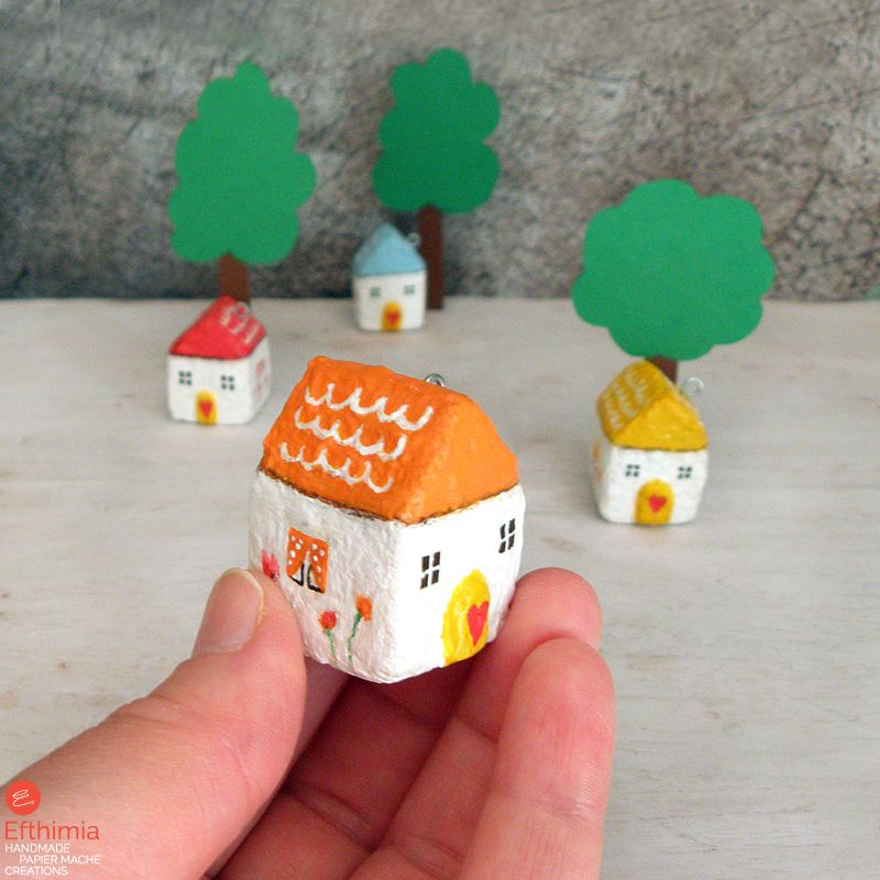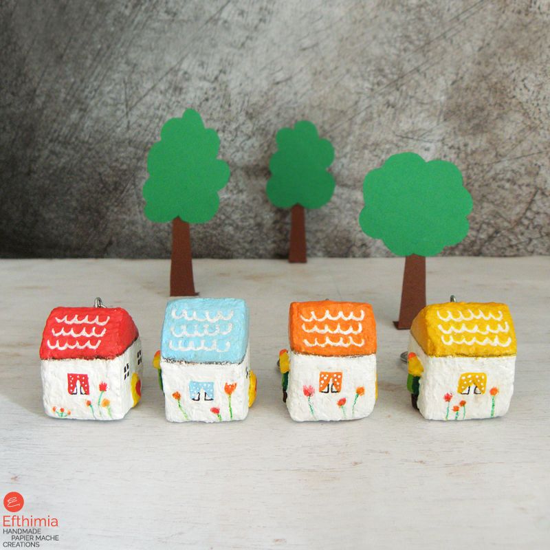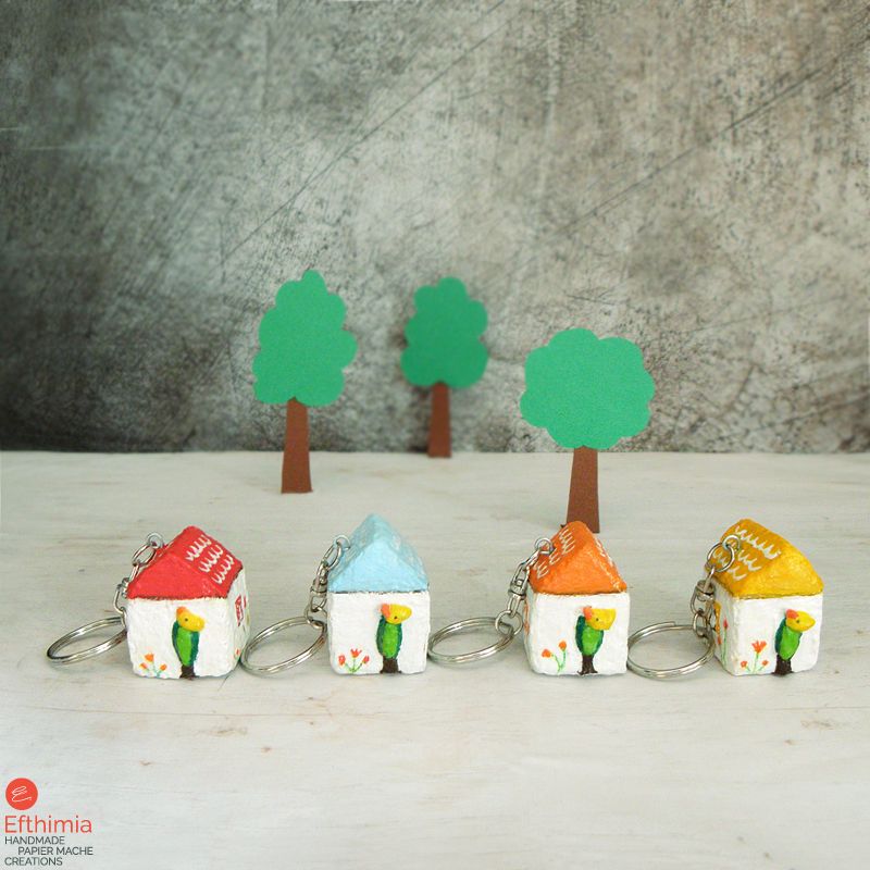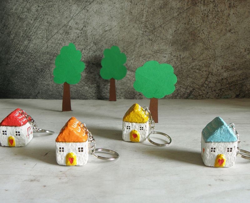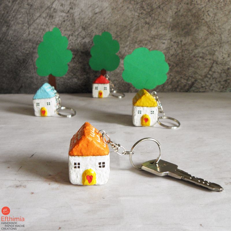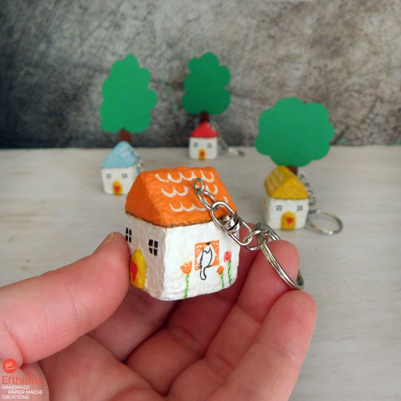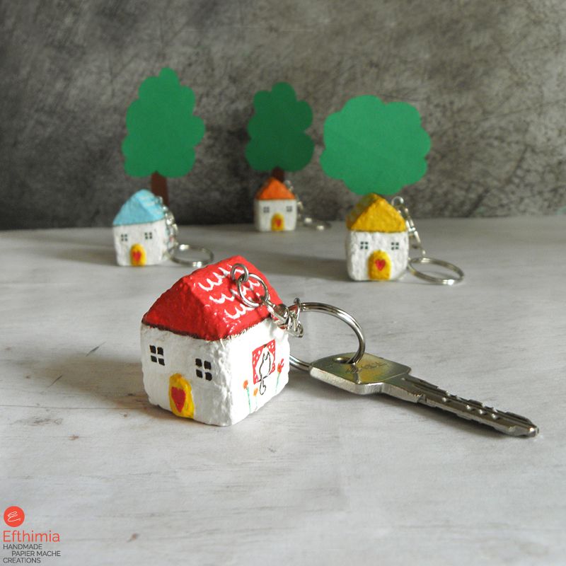 Colorful miniature house key rings, unique and totally handmade by me. These cute houses are made only of paper pulp. There are four colors you can choose from: red, orange, yellow and blue. You can choose your favorite color. They are colored with happy acrylic colors. I used glossy varnish for protection. An ideal and useful gift for you and your loved ones! Also, as a mother's day gift, a housewarming gift, a moving gift, as an anniversary gift, as a wedding gift, Valentine's gift or any occasion that you prefer. AVAILABLE IN 4 COLORS ♥ Materials: handmade paper pulp made by me, acrylic colors, high-quality glossy varnish to protect it, key ring ♥ Care: It's water resistant but NOT waterproof. When necessary, please clean it with a damp cloth. No use of any kind of solution. Please handle with care. It's not a toy so keep it away from children. ♥ Dimensions: Size (approx.) of each house: Width: 2,5cm x Height: 4cm (1in x 1,6in) ♥ All my handmade objects have designed and created by me, Efthimia Kotsanelou
