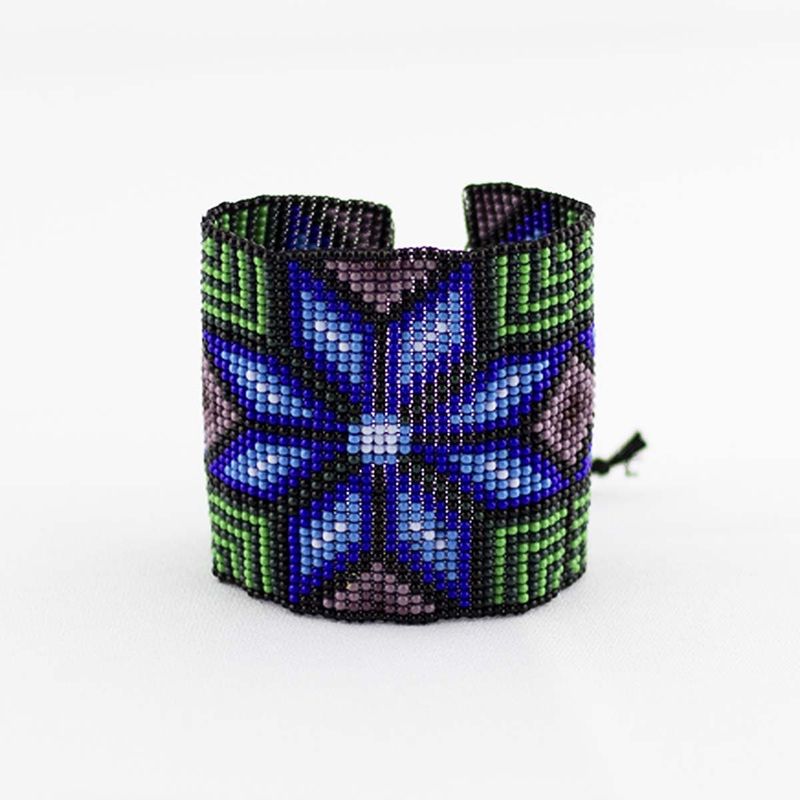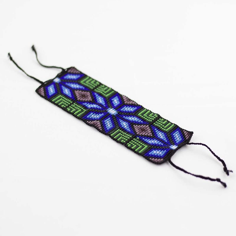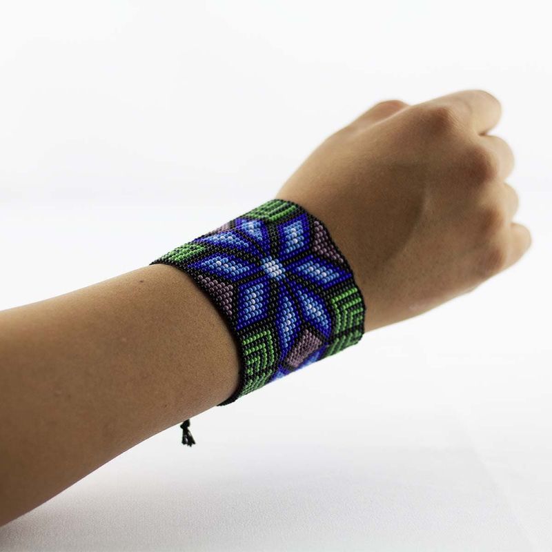 Mexican Bracelet are amazing because it's a really unique craft, the craftsman huichol make them by hand in Nayarit, Mexico. This Mexican Bracelet has a blue flower in the middle and it has two half flowers on each side. Everything else in green and violet.