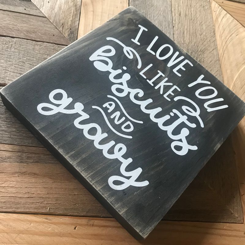 I Love You Like Biscuits & Gravy Sign! These signs are hand crafted and one of a kind. Perfect gift for a house warming, wedding or hostess gift, shelf decoration or just a unique way to say Thank you. This cute little sign will add that special farmhouse touch to an entryway, bedroom, living room or any room of the house. The possibilities are endless! Beautiful hand crafted and one of a kind sign. Each sign is framed using tobacco wood from beautiful Lancaster County PA. Each sign measures approximately 9” x 9” square. Please note, because these signs are handmade, each one may vary slightly and will provide you with a very unique item. Please feel free to contact us with any questions. Thank you for visiting The Country Cowshed! Be sure to follow us on Facebook for updates, specials and more photos: www.facebook.com/thecountrycowshed For more vintage and handcrafted items, you can check out our Etsy listings here: https://www.etsy.com/shop/TheCountryCowshed