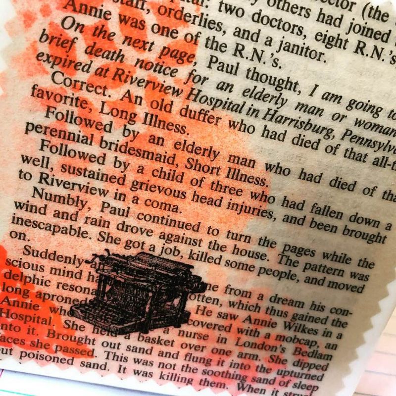 Definitely one of the scariest, most shocking books I've ever read in my life. Even after countless readings, when I know exactly what's about to happen, I still cringe. I found a great typewriter stamp to represent Paul's nemesis, "Ducky Daddles". I've included passages when Paul finds Annie's scrapbook, a glimpse into Annie's psyche when it comes to a well-written story, and the despair Paul feels as he realizes his chances of rescue or escape are razor-thin. Design is in red, edges are black. My coasters are handmade with sturdy ceramic and from what I like to call "rescue books". They come from thrift shops, garage sales, and basements. I give your favorite tales a second life by allowing them to be used in a different and unique way in your home. They are thoroughly sealed to ensure water-resistance from glasses and bottles. Each has feet made of slices of recycled wine corks to protect your tabletop. To clean, damp-cloth the surface.
