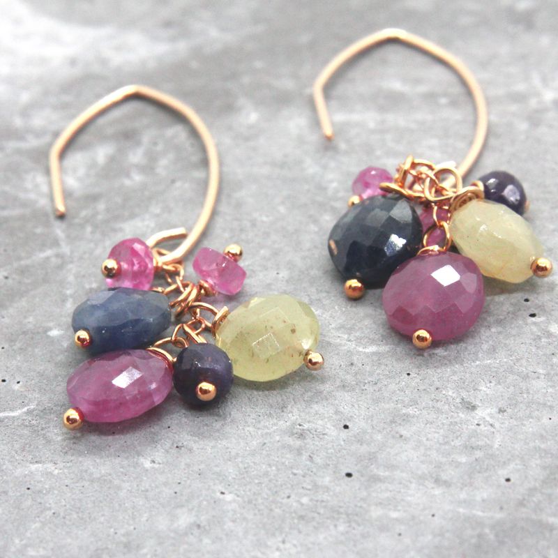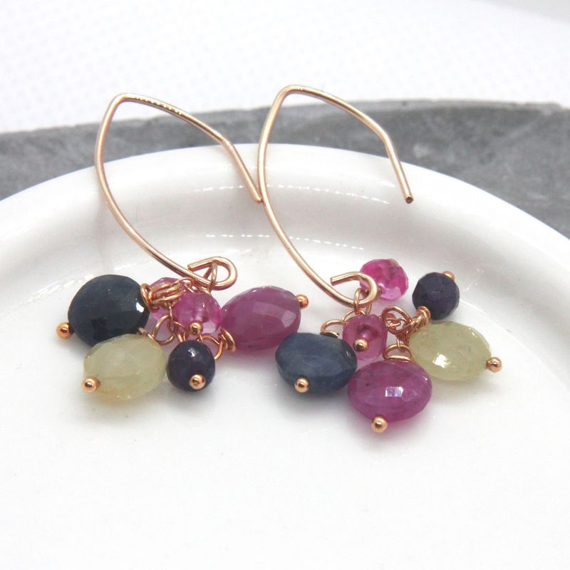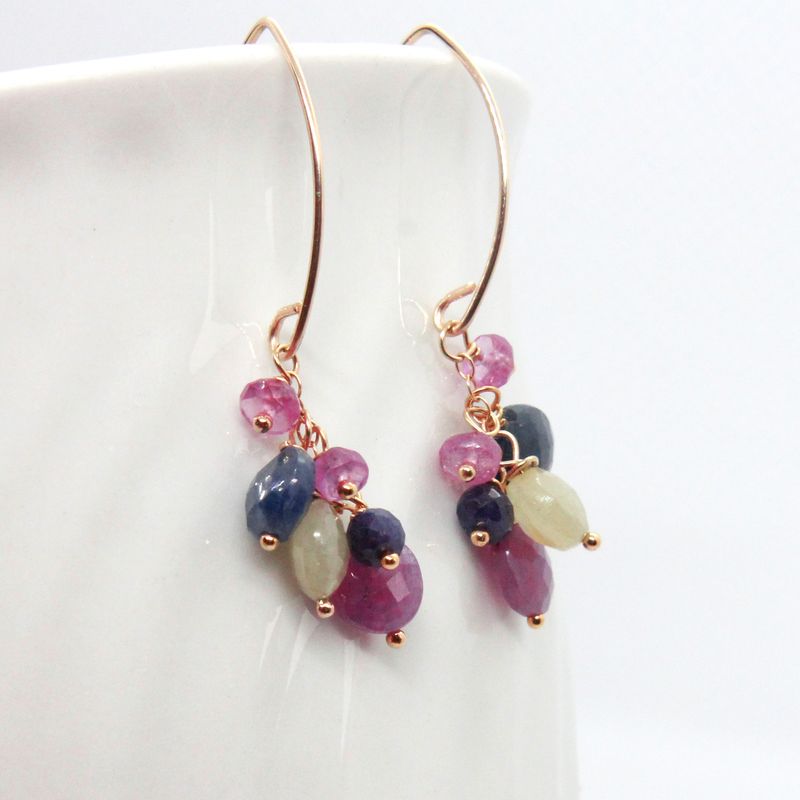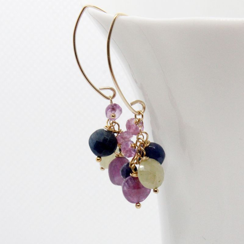 Sapphire cluster earrings made with small, faceted sapphires in different shapes and colors, clustered under my almond shaped, handmade gold ear wires. All gemstones are securely wire wrapped to a piece of gold chain. All metal is 14 k gold filled. Total lenght is 1.6 inches (40 mm) Sapphire is September`s birthstone!