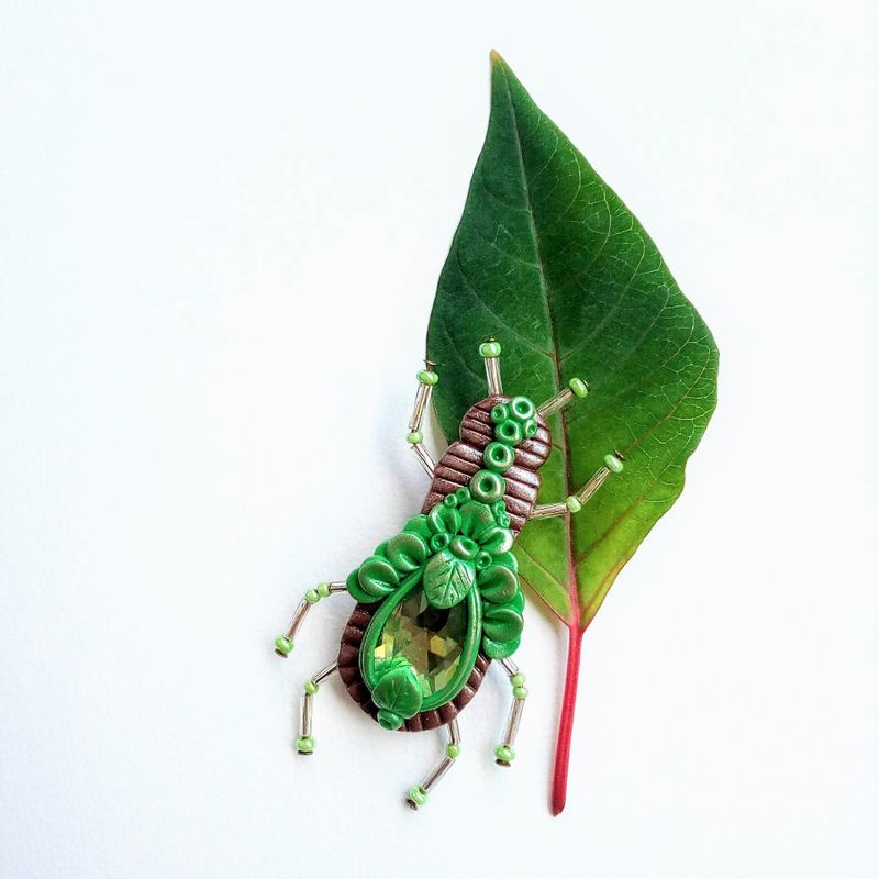 Insect brooch with glass crystal in brown and green tones, handmade from polymer clay and carefully decoradet with petal ornaments. Your coat definitely deserves a new and faithful friend to decorate it. Let this brooch be a bright spot on Your lovely spring coat. Dare to be noticed! SPECIFICATION of the brooch: - 100% handmade; - measurements: length of the body ~5.1 cm (~2 in.), total length (including legs and antennas) ~7,3 cm (~2.9 in.); - colour tones: brown, dark green. The colors can slightly differ from the photo because of photography lighting and monitor settings; - the brooch is coated with glossy varnish; - this brooch is one of a kind.