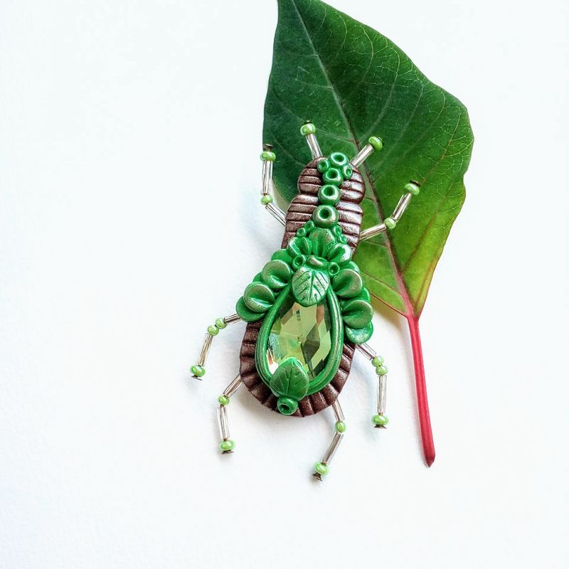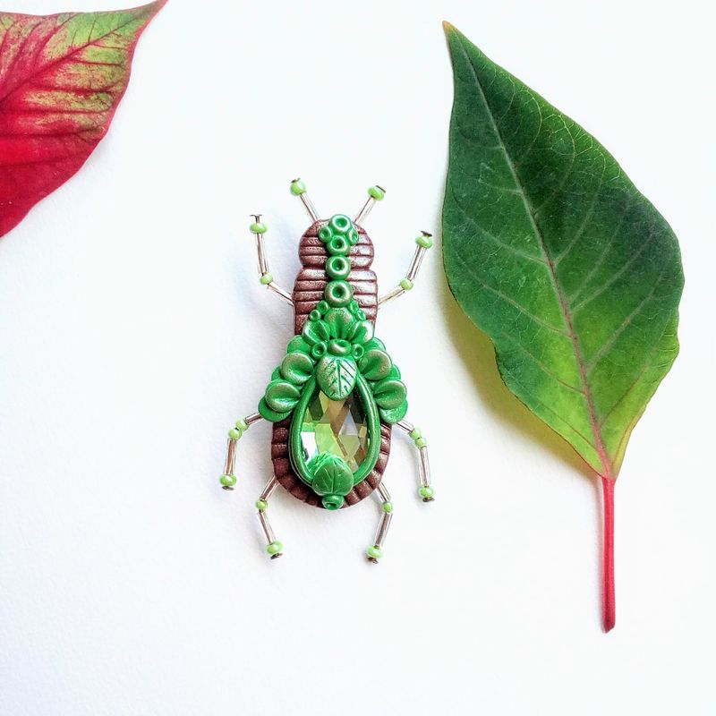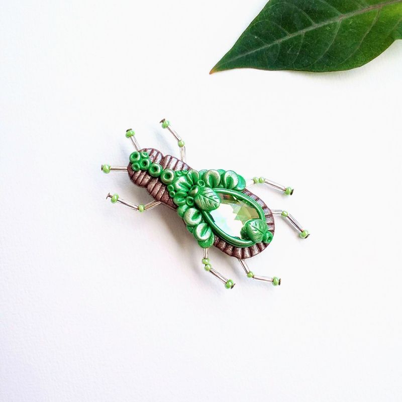 Insect brooch (handmade brown and green tones insect brooch with glass crystal made from polymer clay)