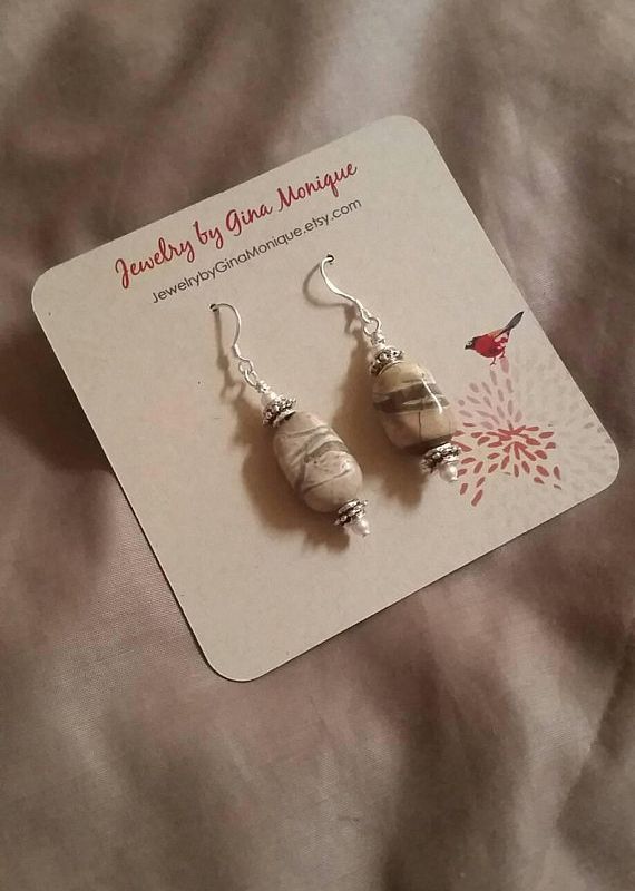 These earrings are made from semi precious stone Jasper, antique silver spacers and ivory colored pearls. These elegant natural stone earrings dangle about and inch and half from sterling silver ear hooks. They can be dressed up for formal wear or made casual for a fun and playful, beachy look . A great gift or treat for yourself. Included is an environment friendly earring card and decorative kraft bag sealed with my shop logo label. Check out my other items: www.jewelrybyginamonique.etsy.com https://www.etsy.com/listing/602149843/jasper-earrings-pearl-natural-jewelry?ref=shop_home_active_6 Like me on Facebook: https://www.facebook.com/jewelrybyginamonique/