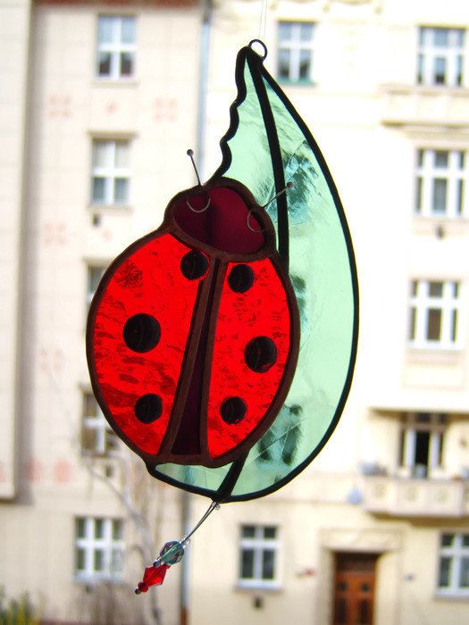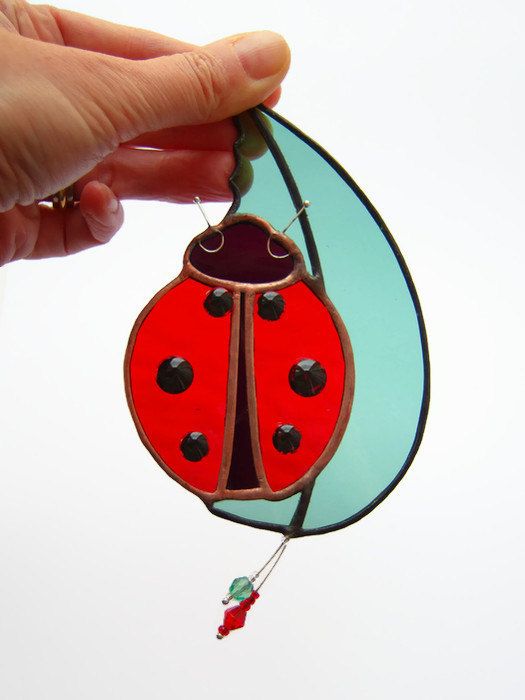 Ladybird, or ladybug, nibbling a leaf stained glass suncatcher window decoration. In lovely scarlet red and pale green glass with Czech glass beads and glass cabochon dots. This much loved bug will catch the sun's rays and brighten up your home the whole year round - even on a cloudy day, it looks lovely. 📏 size: 15 x 8 cm (6" x 3+1/4") 🎁 GIFT IDEA Perfect for gardening friends to hang in their greenhouse or sun room. There is a loop at the top for hanging and comes with cord and a window sucker-hook and carefully packaged in a presentation gift box. 🐞 Other creatures can be created into suncatchers - just ask and I'll design and make one for you. ⏳ As it's a made to order item, please allow 5-7 days for production. 🛃 Please note that this item ships from the Czech Republic (EU) and all customs and tax duties, to non EU countries, are the responsibility of the buyer. Thank you for understanding.