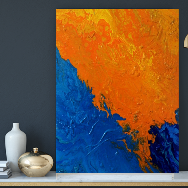 Enhance your home or office with this original* stunning vibrant abstract work of art. Rendered in acrylic textured paint, plaster, and other materials. * Only one produced! *** ABOUT THIS PAINTING *** ~ Size: 30” x 40” x 1.5” ~ Medium: Acrylic, Plaster, Gloss finish. ~ Hand painted. ~ Certificate included. ~ Main Colors: Old Gold, Cadmium Orange, Cadmium Red, Vermilion Red, Metallic Silver, Metallic Gold, Ultramarine Blue, Sapphire Blue. Midnight Black