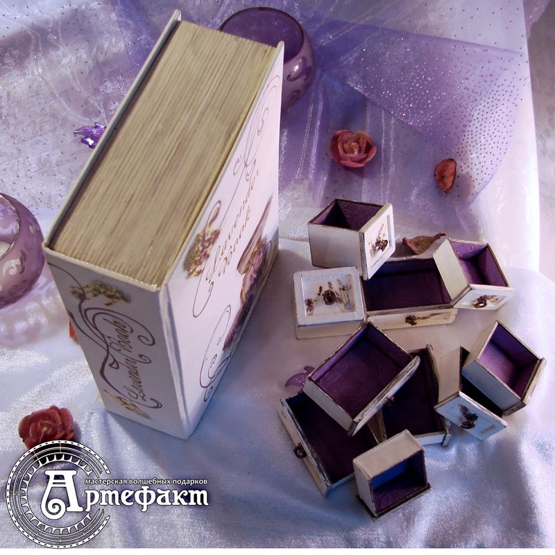 This jewel-case is useful for keeping different valuable little things and then putting it on the bookshelf. This item is made of braided cardboard (thickness 1,75 mm) and natural book material.It is painted with acryl and the grips are made of patinated copper. The inner interior is made of scrap paper partly covered with the acrylic varnish. This jewel-case is 100% handmade. It was made following the original drawings and with the manufacturer's fabricated parts. This item is unique and can't be redone. Size: 150х210 mm (А5 size), thickness 60mm. Drawers size: 60х38х16mm, 38х38х30mm, 38х38х16mm.
