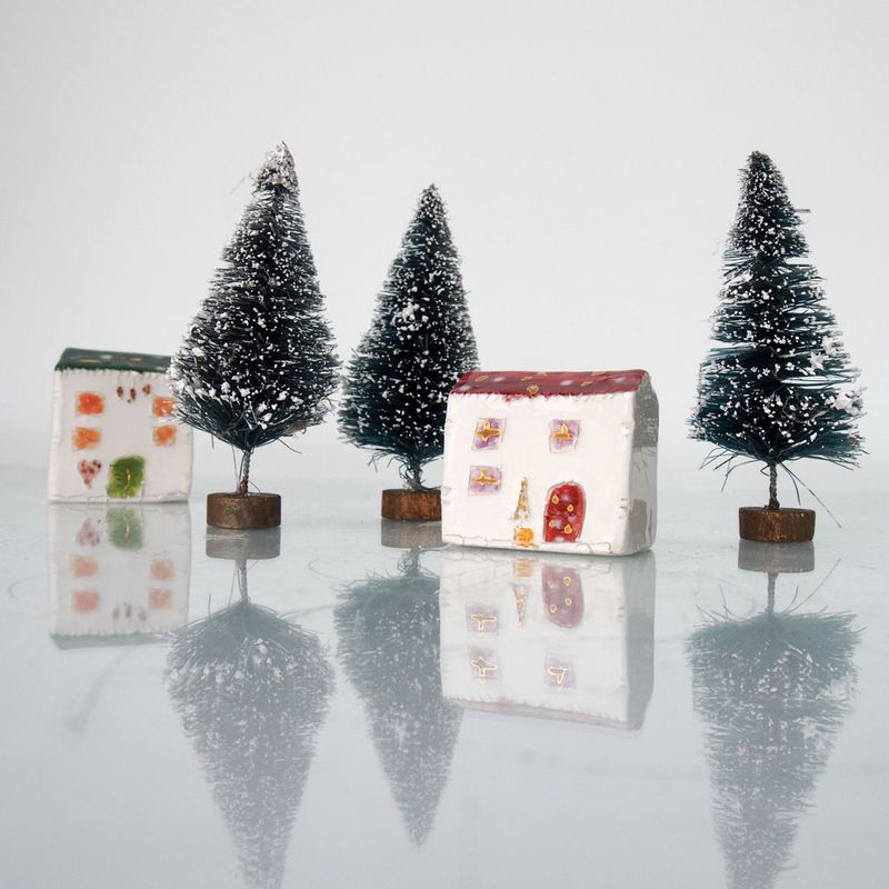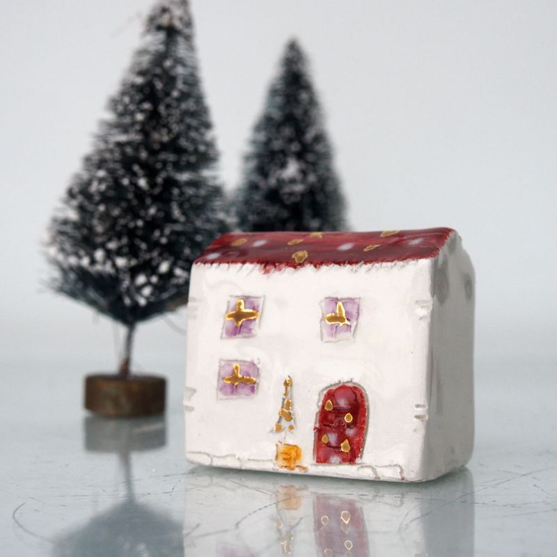 Handmade Miniature ceramic house with golden details - New home gift, little Clay House - Small Handmade clay house This beautiful miniature clay house is made by me in my home studio. It's unique and collectible. This tiny clay house would be a perfect decoration for a little nook of the house or on your printer tray, terrarium... My little houses are made of white stoneware clay, and fired. After firing, the clay sculptures were painted and glazed with clear non-toxic glossy glaze and fired again. Because of gold it was fired in kiln 3 times. Process takes about 3 weeks. With this listing you will receive one house with red roof and some golden details! Dimensions aprox: House - 4 cm - 1,4 inches