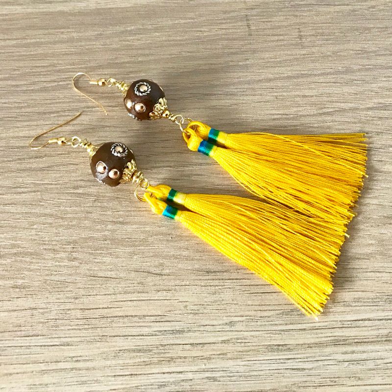 ** https://www.etsy.com/au/listing/606897228/long-tassel-jhumka-earring-kundan?ref=shop_home_active_6 ** An exclusive long ethnic tassel statement earring with Kundan beads. With the gorgeous Kashmiri beads wired on yellow silk tassels, this earring is one of its kind. It blends the modern and the ethnic style. Based on golden elements, this Kashmiri jhumka is made with brown and golden Kundan beads, golden yellow tassels, small golden ball spacers, golden wire, and gold ear hooks. It has a classy ethnic look that will add to your beauty on any traditional occasion and evening parties. Looks great when combined with a traditional outfit and stone studded high heeled sandals. Item is ready to be shipped. Treat your jewelry with care. Avoid contact with water, perfume, hair spray, and deodorants. Clean with a cotton ball or a soft jewelry polishing cloth. Item Description and Materials Used - Brown Kashmiri Kundan Beads Golden Yellow Silk Thread Tassels Golden Ball Beads Earring hook Golden Beading wire Length of drops - 4.5 inches (11.43 cm) Length of tassel - 2.5 inches (6.35 cm) Please Note - For hygiene purpose, the ear wires will be replaced with a new one when you order. For similar items, please click on the link below - https://www.etsy.com/shop/deckorate?section_id=24187233 For information on Returns and exchange, please refer: https://www.etsy.com/shop/deckorate#policies Order together to pay single shipping. Thank you for visiting my shop https://deckorate.etsy.com Love unique. Buy handmade. ❤ Madhuleena