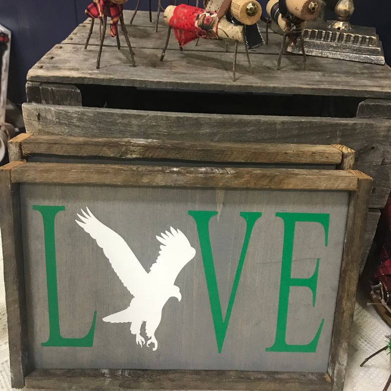 Love Eagles Sign! These signs are hand crafted and one of a kind. Perfect gift for a house warming, hostess gift, shelf decoration or just a unique way to say Thank you. Fun, lovable and unique....perfect sign to give as a gift or keep for yourself 😊 This rustic man cave sports sign will add that perfect touch to an entryway, bedroom, living room, sports room, bar or any room of the house. The possibilities are endless! This Eagles football sign measures approximately 12 inches x 8 1/2 inches. Please note, because these signs are handmade, each one may vary slightly and will provide you with a very unique item. This is my original design. Please feel free to contact us with any questions. Thank you for visiting The Country Cowshed! Follow us on Facebook for updates, specials and more photos: www.facebook.com/thecountrycowshed