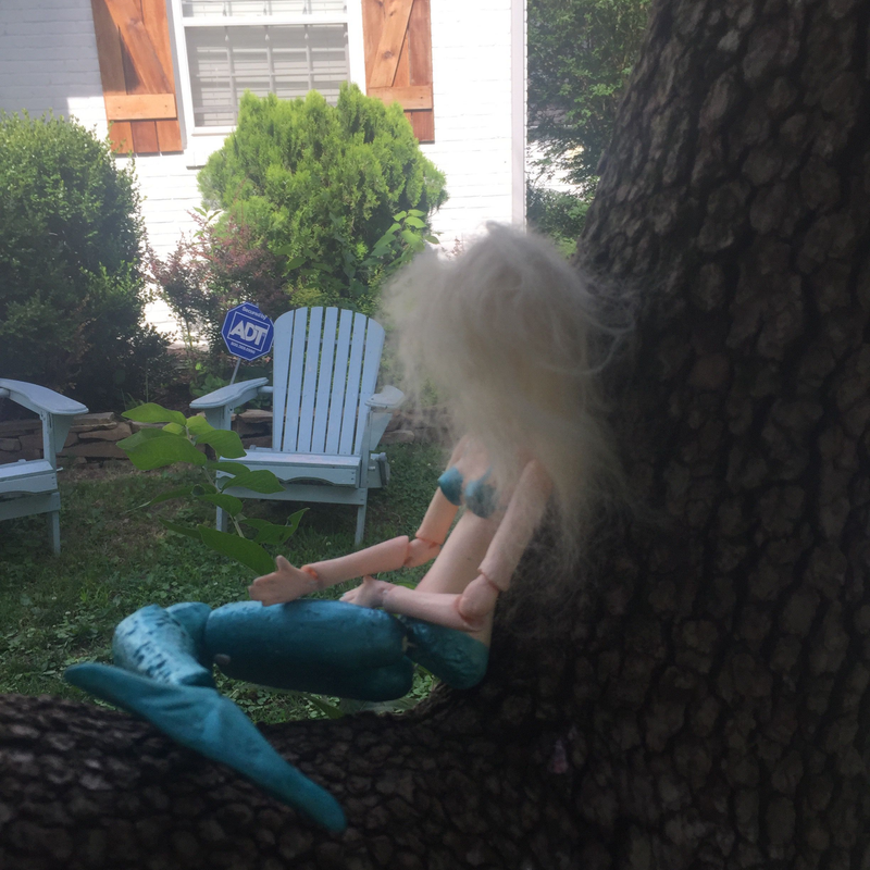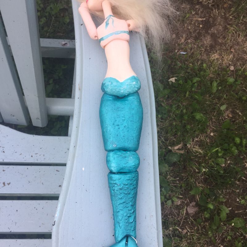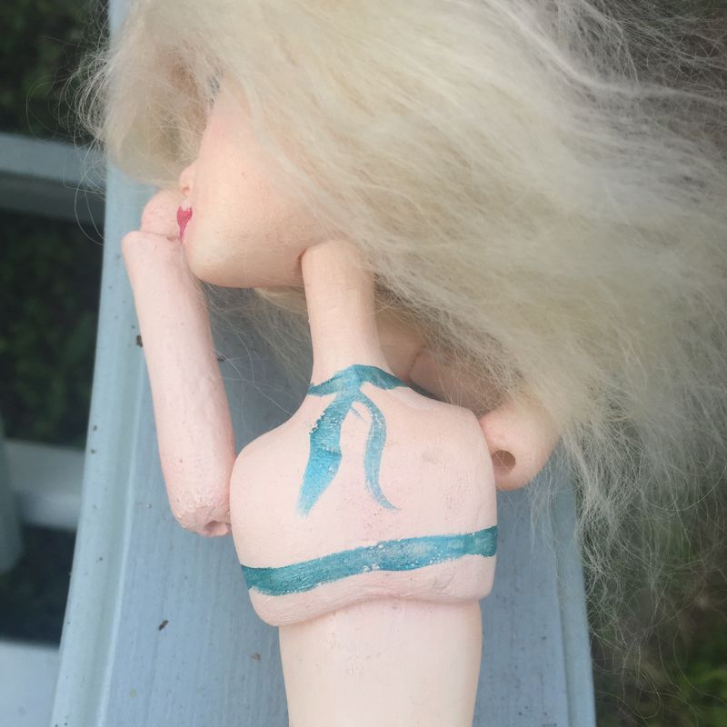 Maggie the Mermaid is a resin art doll. She was lovingly sculpted in paper clay and then cast in resin. She is painted in acrylics, pastels and colored pencils and has been sealed with Mr. Super Clear. She comes as shown with painted domed, teal, paper clay eyes and a handmade, wispy mohair wig. She is strung with elastic cord. She loves warm air and sunshine. She wishes to live near the water. She will sing songs of the sea to your soul. Although she is not a child’s toy, she loves to gently pose for pictures. She especially loves the wind in her hair. Maggie is also available as a blank doll that can be customized. Although she may have sisters, no two will ever be exactly alike. When you purchase Maggie, you promise to never recast or copy her in any form.