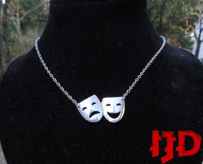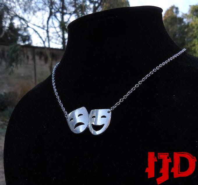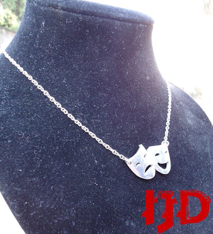 A beautiful theater masks necklace, made out of aluminium, never loses color, never bends or brakes. A great gift for any actor or any fan of the performance arts, there is also a golden variant, and any part can be personalized. Just send me a pm here on Etsy and your wishes shall be granted.
