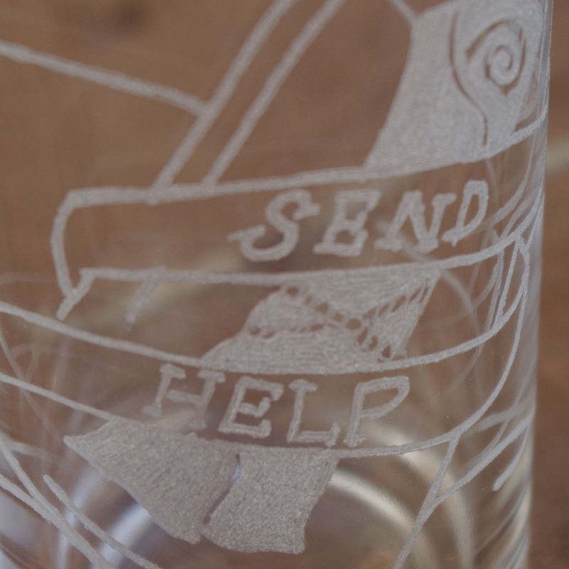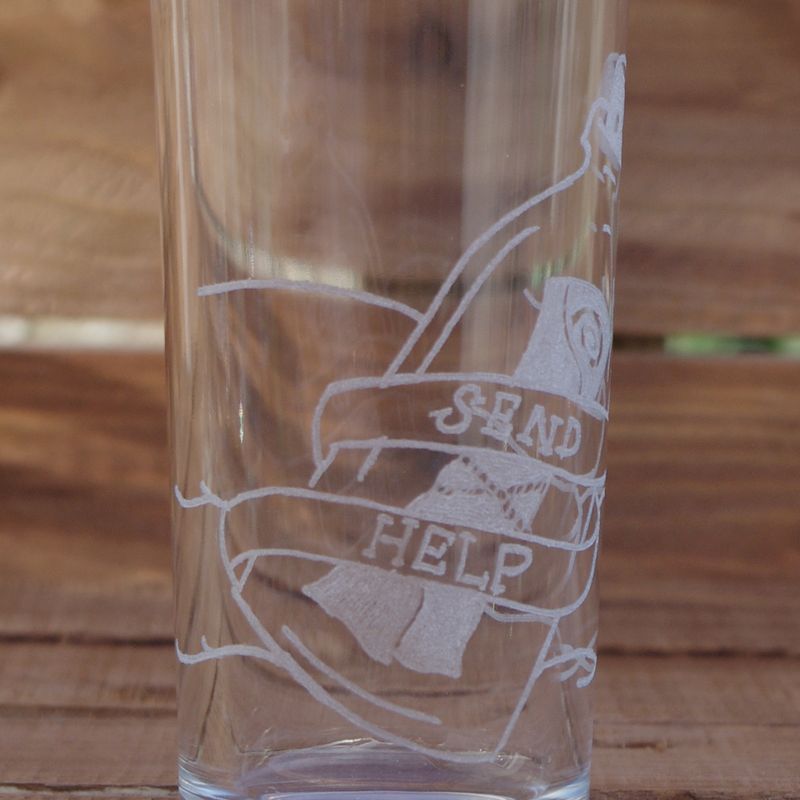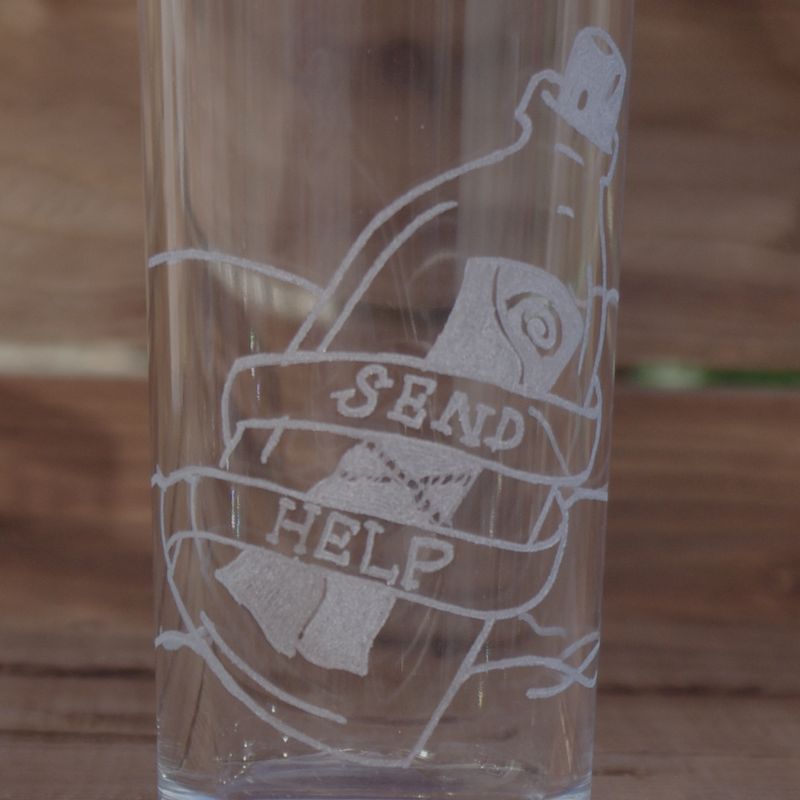 This message in a bottle glass would make a great birthday, anniversary or christmas gift for anyone interested in sailing or tattoo art. This half pint glass has been engraved by hand and features a message in a bottle design with the wording "Send Help". SHIPPING FROM THE UK - Shipping Prices Vary - www.redvesseldesigns.com