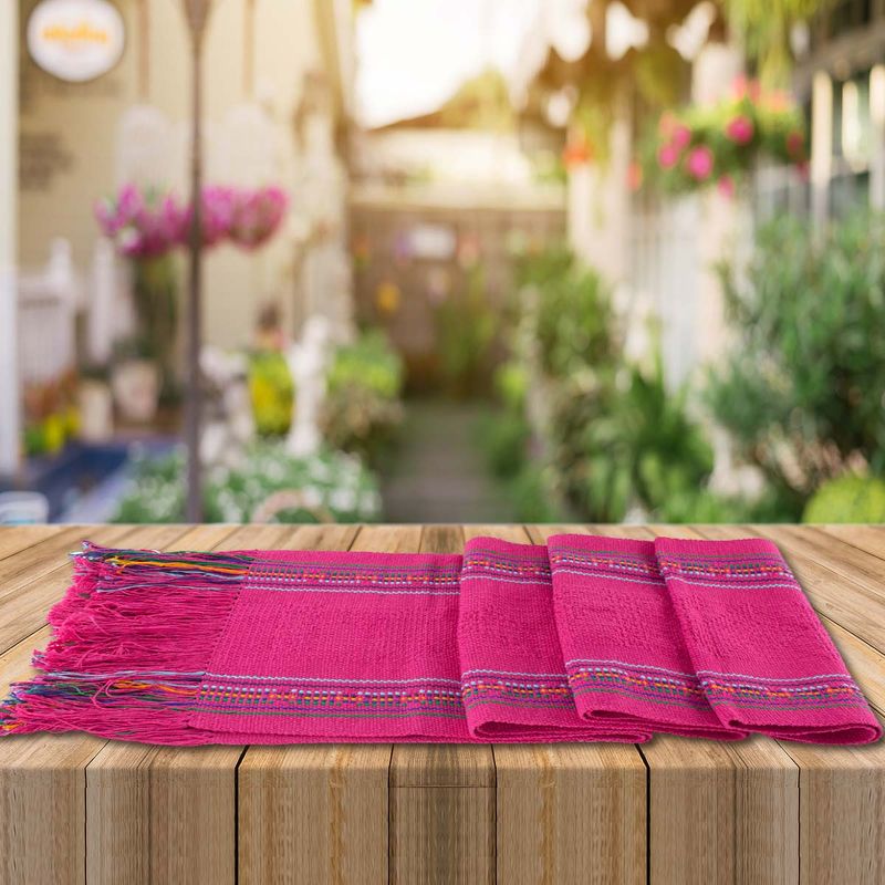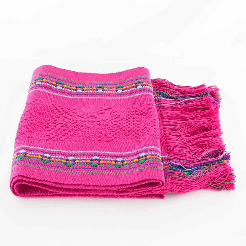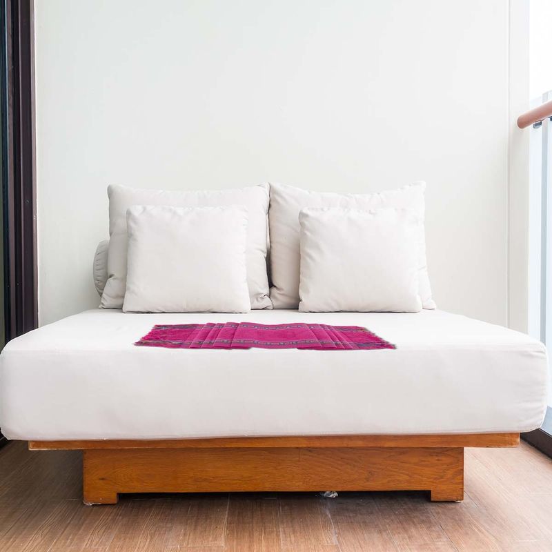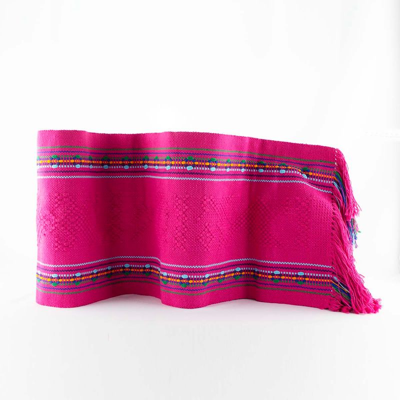 Mexican Table Runner is handwoven by Mexican artisan in Oaxaca, Mexico. Mexican Table Runner is pink color with vibrant colors in several rows. The bed runner or table runner is woven using the traditional waist-loom weaving technique an each takes several days to complete. Mexican Table Runner give us space colorful dining table decor or add color the bedroom decoration or dining room decor.