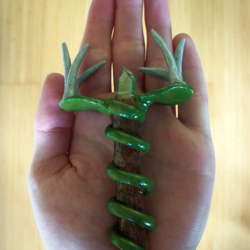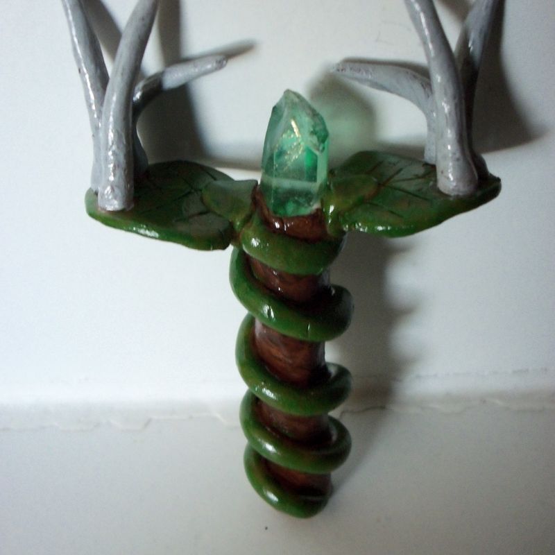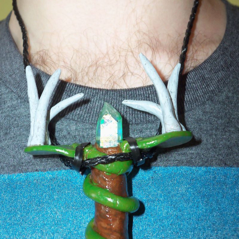 Become one with the power of nature and wield a magical staff imbued with the power of the wilds! This staff has been created using high quality polymer clay and forged into the style of the druids themselves. Painted and varnished with an ancient look to bring out the natural colours, topped off with a crystal of pure green quartz (with magical properties?). Call upon your beastly companions with the deer-themed, antler finish. You can choose the staff by itself, or opt for it to be combined into the creation of a necklace, as a large pendant. The staff will come connected to a 3mm thick, black, braided, leather choker and then you can wear it on your adventures! The staff shown measures 10cm x 4cm (4" x <2") and hence, will really stand out. However, a half size of 5cm x 2cm is also available for order, if you prefer a smaller pendant! If you have any other questions, feel free to ask me. https://www.etsy.com/listing/596665565/miniature-fantasy-druid-staff-w-necklace