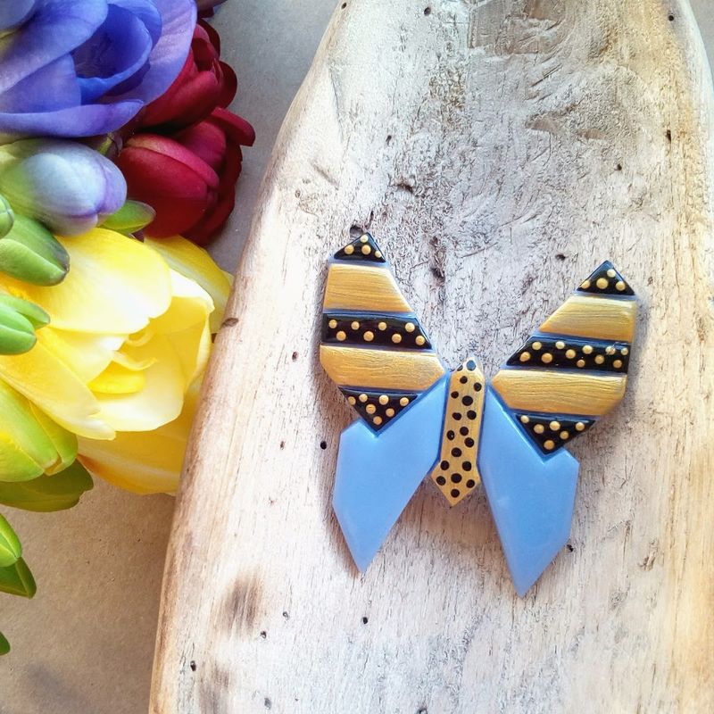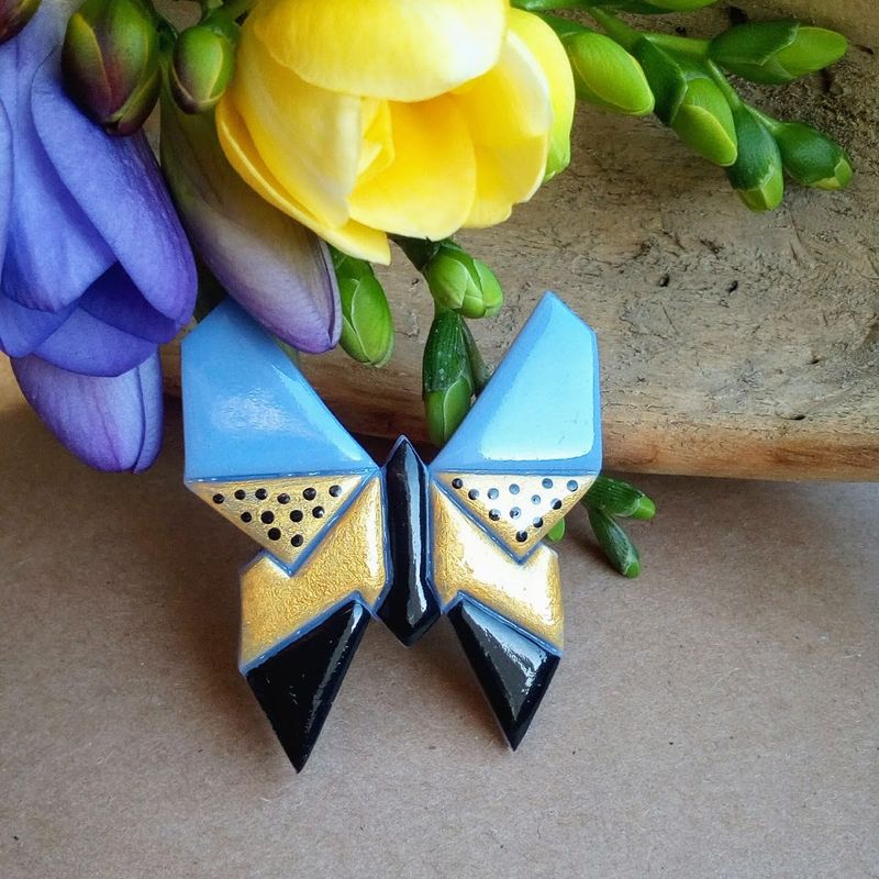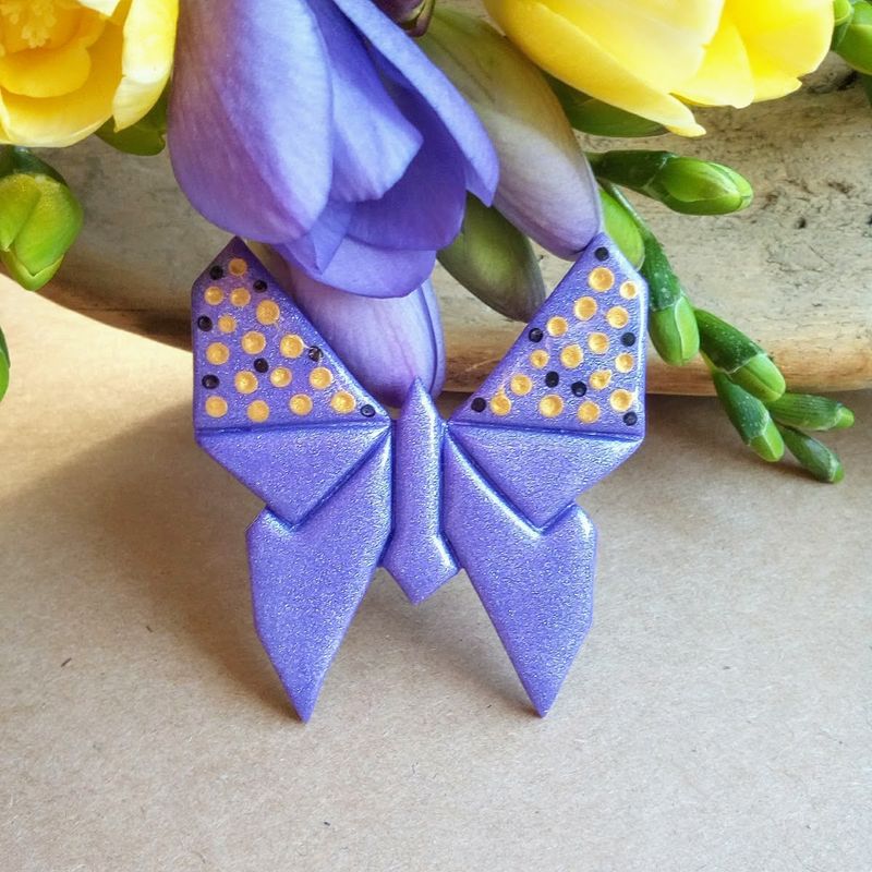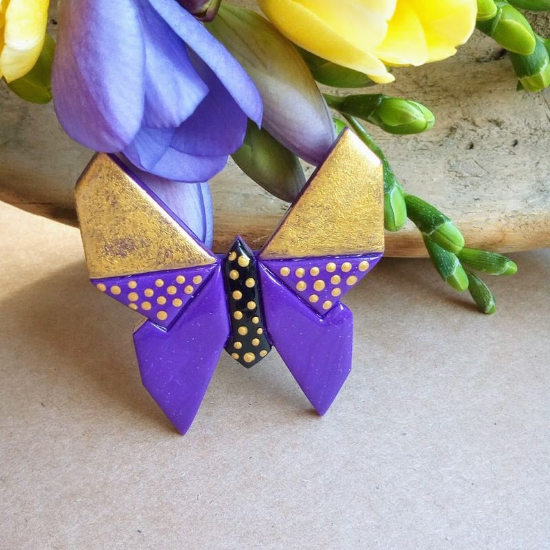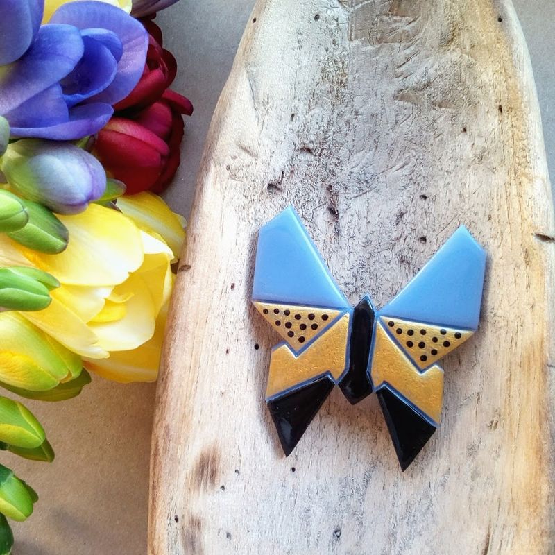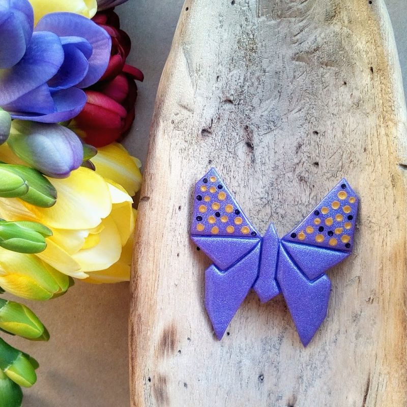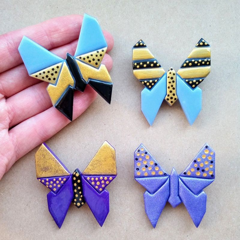 Minimalist graphic origami style butterfly brooches made of polymer clay