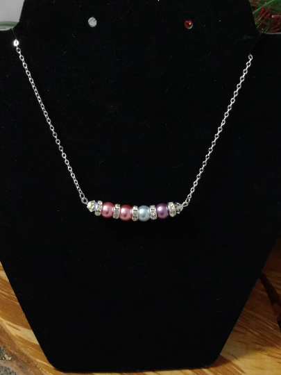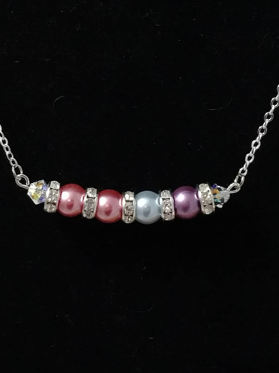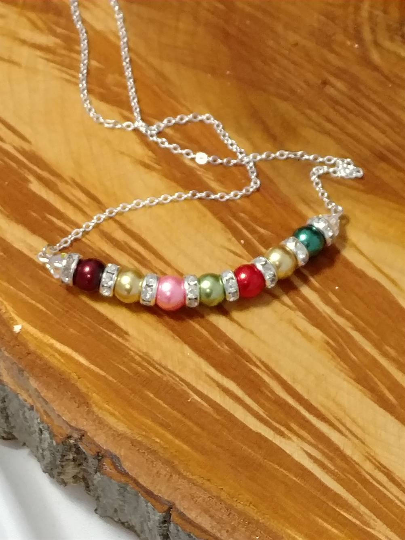 Everyone deserves something special, and this necklace will soon become one of the most favorite and treasured gifts. A personalized mother/Grandmother Necklace. Each necklace has the pearl that represents the month each child or grandchild was born in birth order. A great way to showcase your family. Any Mom will absolutely be proud to wear it. Simple yet elegant! These would be great for Weddings and Bridal parties in your color theme also. A great gift for Mom's, Grandma's, Sister, Aunts, Friends and even for yourself! A beautiful way to display your kids and grandkids alike. She will love you for it. Great for Christmas, Birthday's, Mothers Day and even Anniversary's! MATERIALS: This is made with Glass pearls, silver plated chain, Swarovski crystal Rondelle spacer beads, jump rings, head pins, lobster clasp.