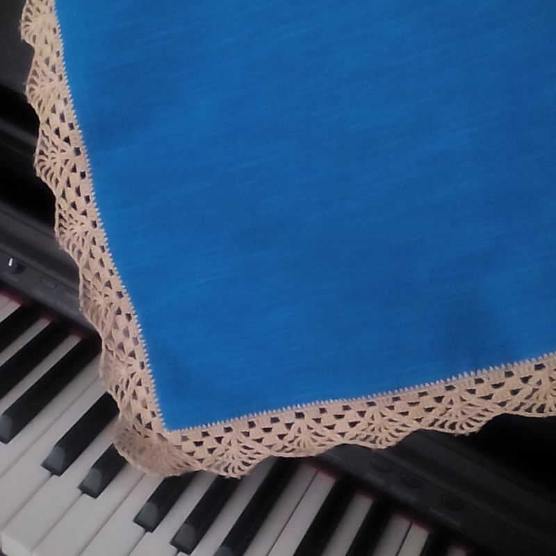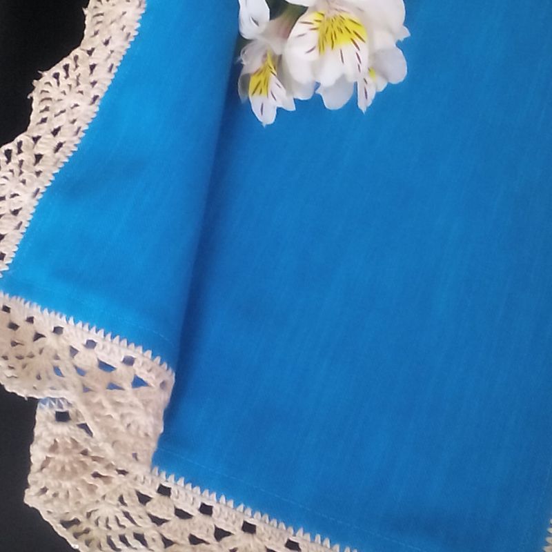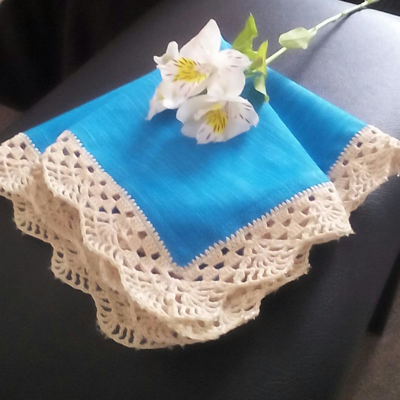 Napkin for kitchen, cotton and beads, turquoise and beige color, handmade, crochet. Size with lace: 42x47 cm.