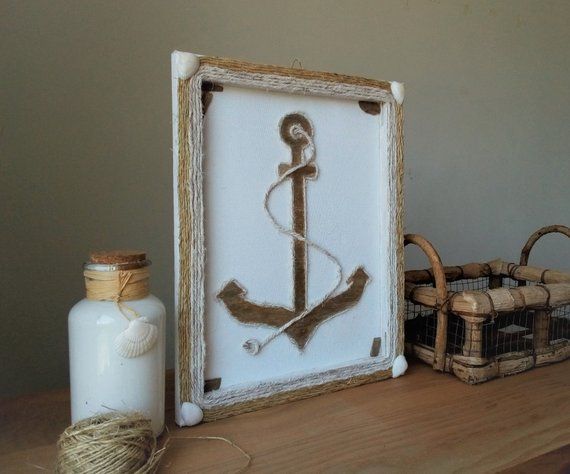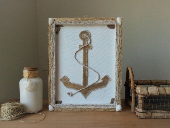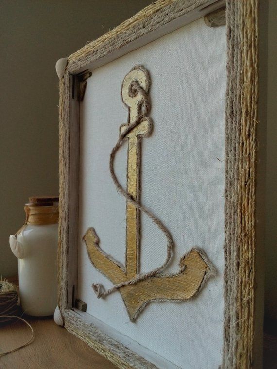 Anchor is made from cardboard painted with gold acrylic paint. Around it is hand dyed white rope. Wooden frame is decorated with white and beige rope and seashells. Dimensions 36 cm x 28 cm (14" x 11") Handmade. Unique