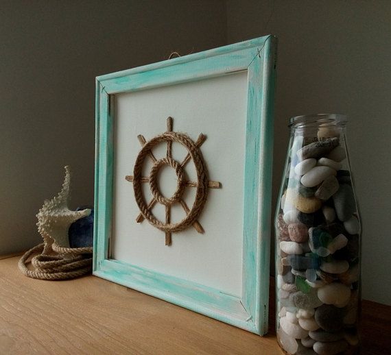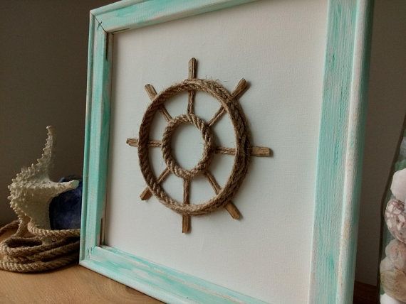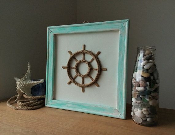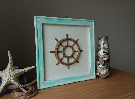 Turquoise rustic summer wall decor. Ship wheel is made from rope and driftwoods. Wooden frame is painted with acrylic paint. Dimensions 30.5 cm x 30.5 cm (12" x 12")
