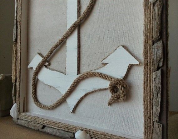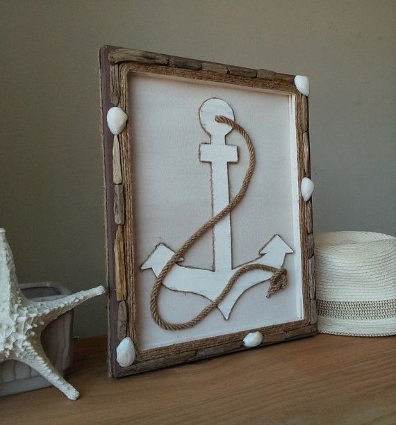 Anchor is made from cardboard, painted with white acrylic paint. Wooden frame is decorated with rope, driftwoods and seashells, and colored with brown acrylic paint. Dimensions 36 cm x 28 cm (14" x 11") Handmade. Unique