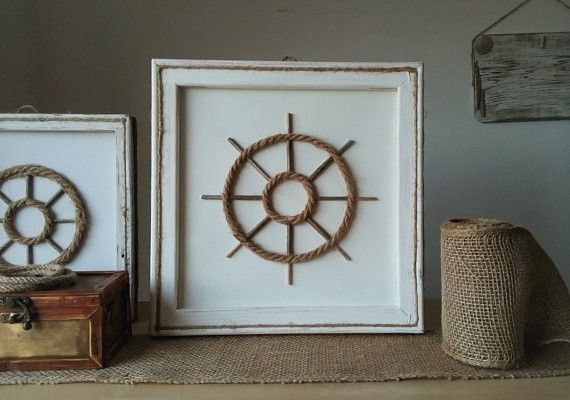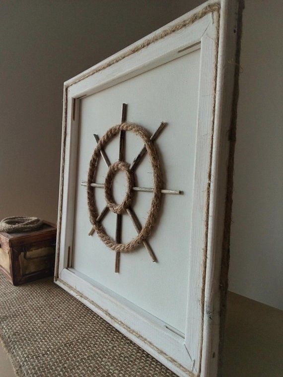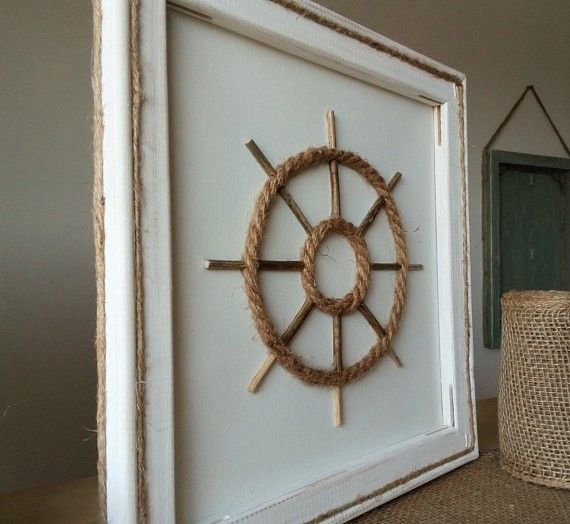 Rustic summer wall decor. Ship wheel is made from rope and sticks. Wooden frame is painted with acrylic paint and decorated with thin rope. It can be nice decor for home, office or cottage. Also, it can be appropriate gift for many occasions and celebrations: Anniversary, Mother's or Father's day, Birthday, Wedding, Moving, Housewarming... Dimensions 30.5 cm x 30.5 cm (12" x 12")