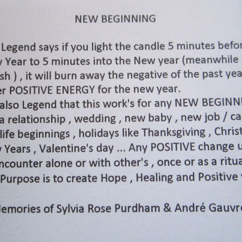 ~ New Beginning candles ~ 2 hand rolled beeswax candles in color pink ( the pink may vary ). The beeswax pattern may vary from honeycomb to stripped or flat. They are about 2 inch high with cotton wick These candles come with a legend and instructions of how to use them. ( as seen in picture ) The purpose is to erase the negative energy from the past and welcome new positive energy. The pink candles represent : LOVE Can be used alone or in a group These candles are also great for holidays like Thanksgiving, Christmas, New Years, Valentines day ...
