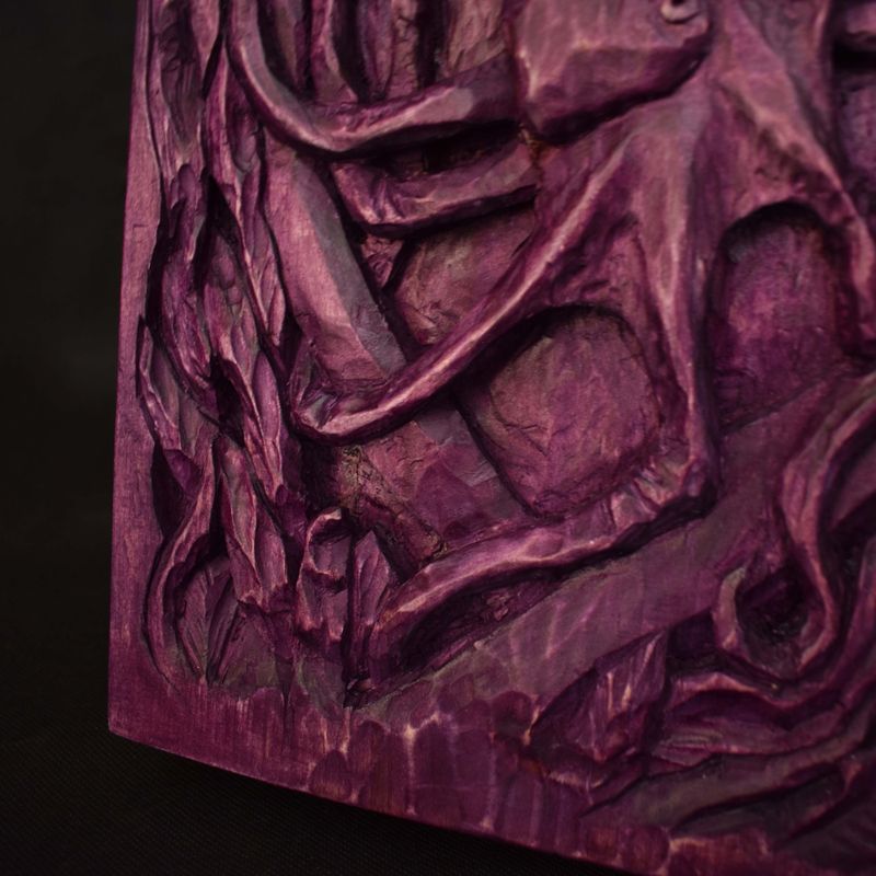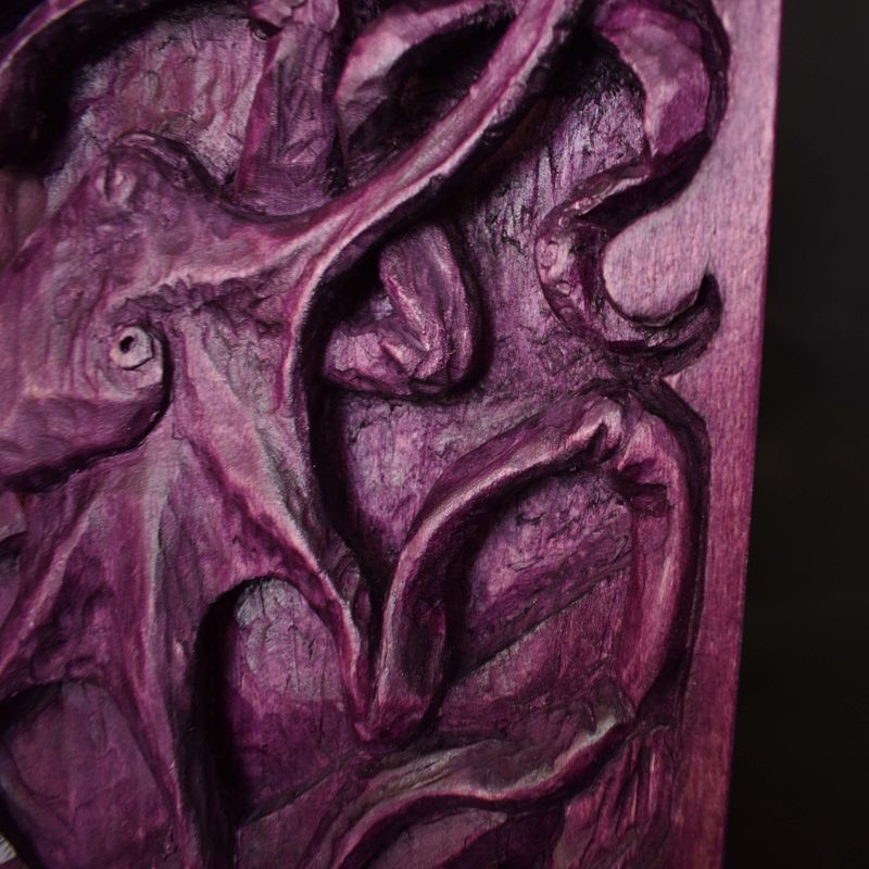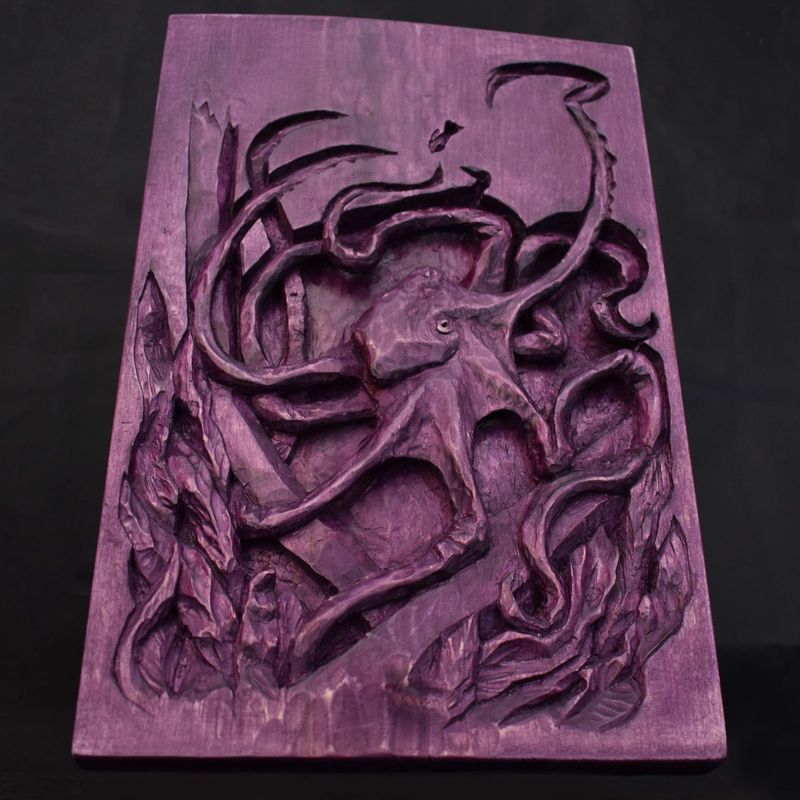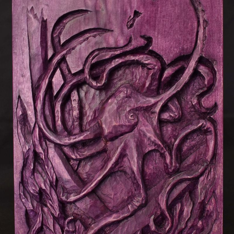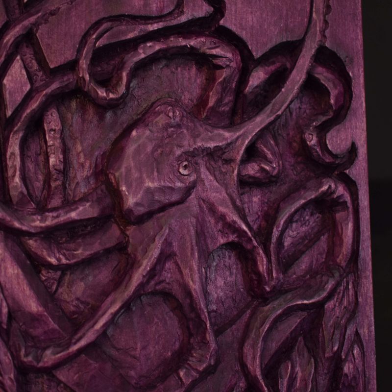 Octopus wood relief, handmade carving, basswood sculpture, purple