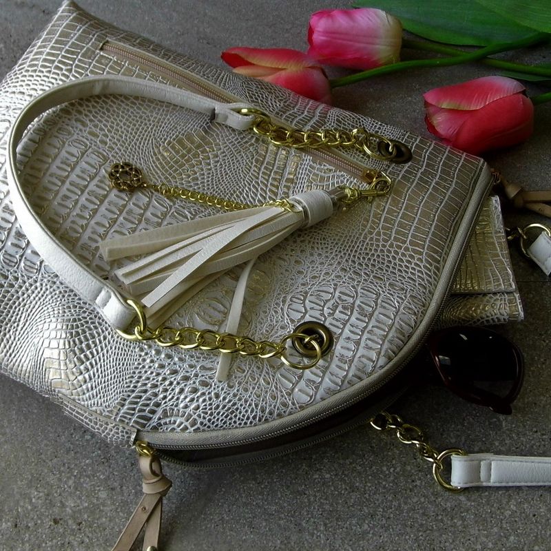 SOLD-Off white handbag, Large vegan leather bag, Oversized purse with handles, Faux crocodile bag, White bag gold chain, Unique design handbag