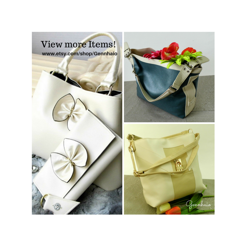 The ‘Meka’ off white handbag is handmade from faux crocodile vegan leather. This oversized purse with its gold chain strap handles has a unique design, which makes it even more eye-catching. There's lots of room: three interior pockets and one exterior pocket. Approximate Size: (H) 12 inches (31 cm) x (W) 9 inches (23 cm) x (D) 3 inches (7.5 cm) Available from my Etsy shop: https://www.etsy.com/listing/602849964/off-white-handbag-large-vegan-leather?ref=shop_home_feat_2 Please contact me if you have any questions. www.etsy.com/shop/Gennhaio