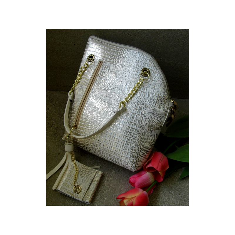 SOLD - Silver tote bag, Vegan tote bag, Faux crocodile bag, Weekend tote, Cream tote bag, Womens weekender bag, Bag with pouch, Overnight bag