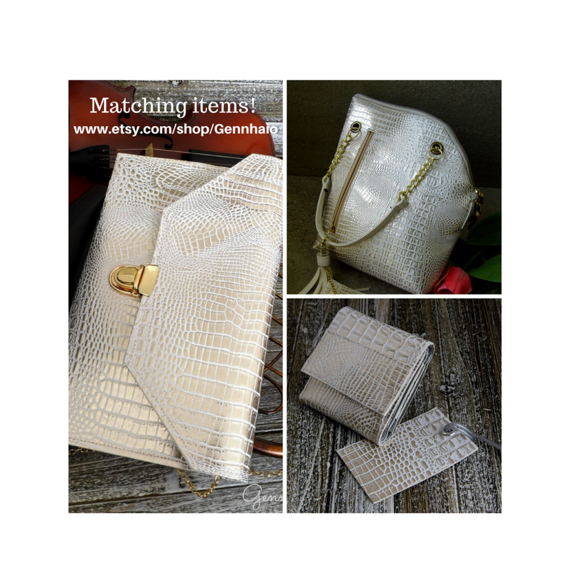 The ‘Cole’ off white handbag is handmade from faux crocodile vegan leather. Great care and detail can be seen in the unique design of this handbag. The curved rectangular shape of the silver handles mirrors, the shape of the bag. Its sleek lines create a sophisticated bag, which makes it a perfect gift for special occasions, such as birthdays, anniversaries, graduations, and many other celebrations. Approximate Size: (H) 11 inches (28 cm) x (W) 11 inches (28 cm) x (D) 3 inches (7.5 cm) Available from my Etsy shop: https://www.etsy.com/listing/616689837/off-white-handbag-white-handmade-vegan?ref=shop_home_feat_1 Please contact me if you have any questions. www.etsy.com/shop/Gennhaio