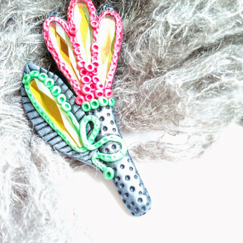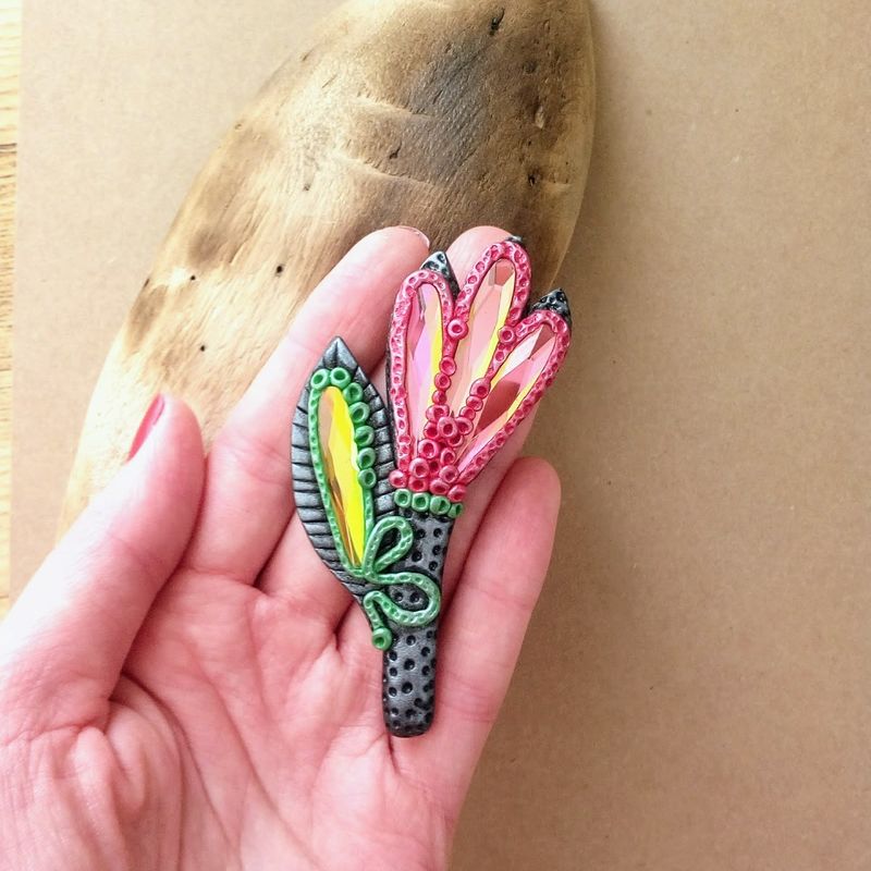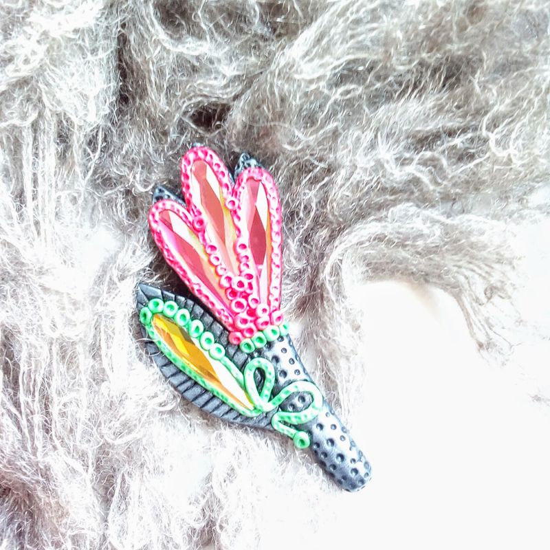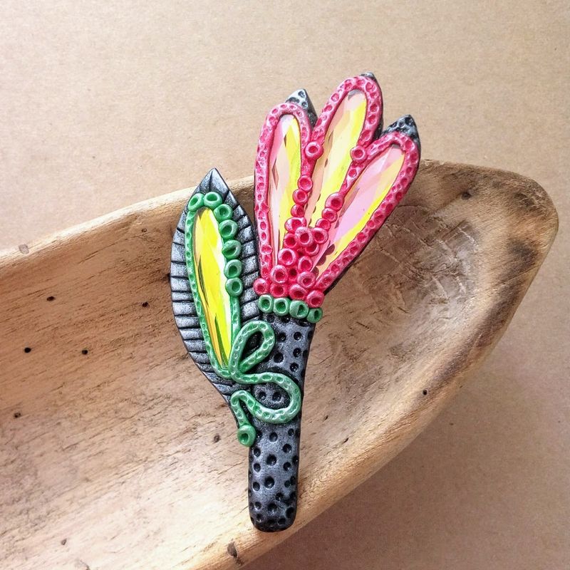 Unique flower brooch made of polymer clay and glass crystals. This brooch was made with care and big attention to details. Dare to be noticed! SPECIFICATION of the brooch: - 100% handmade; - measurements: total length of the brooch ~8.4 cm (~3 in.), width at a widest point ~2.8 cm (~1.1 in.); - colour tones: black, red, green, yellow, . The colors can slightly differ from the photo because of photography lighting and monitor settings; - the brooch is coated with matte varnish; - this brooch is one of a kind.