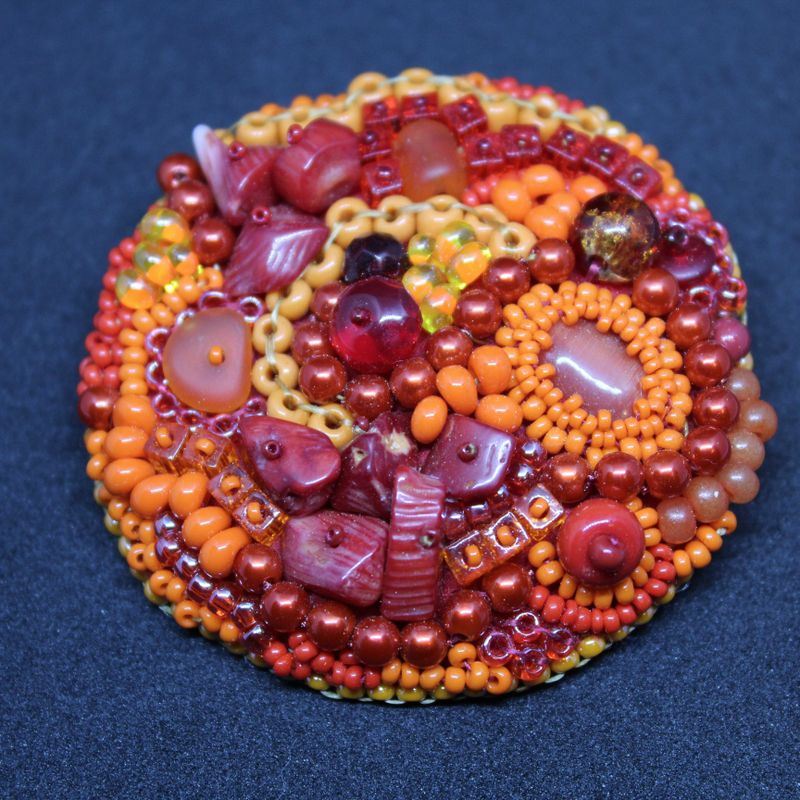 Bead embroidered brooch from different beads by materials, sizes and shapes. beaded on felt base. Back is from forming felt. Diameter 6 cm