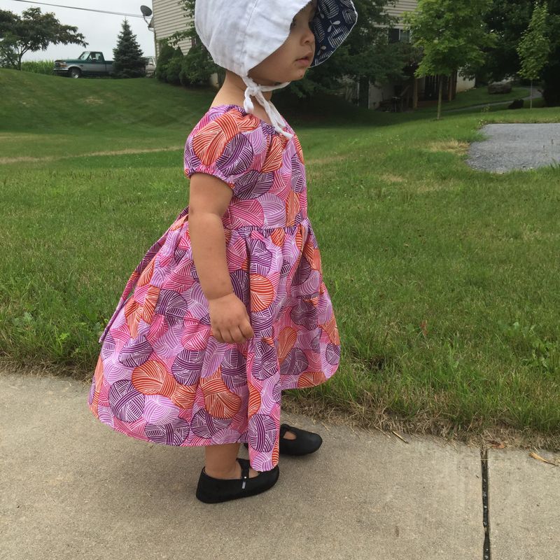 This dress is an easy on/off dress requiring no buttons, snaps, or zippers. Stretchy elastic neckline makes sliding it on a breeze. Made from a vibrant pink printed organic cotton