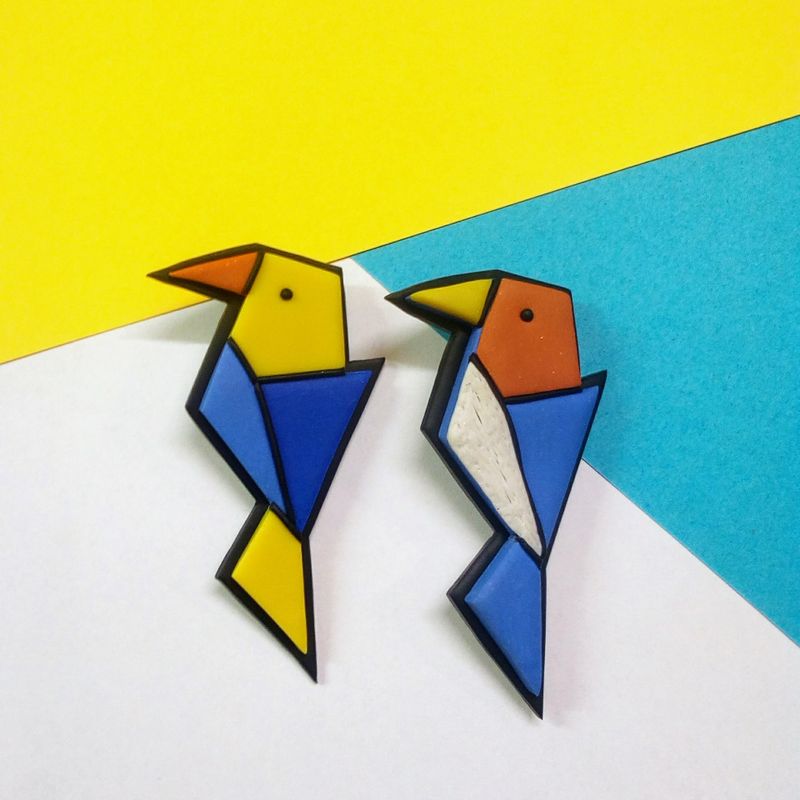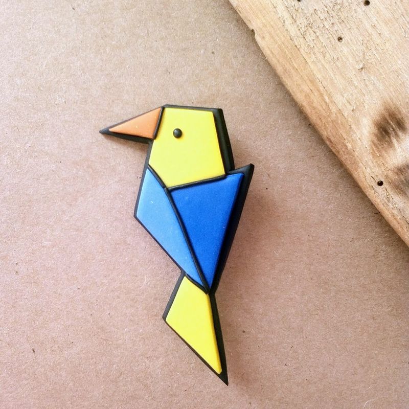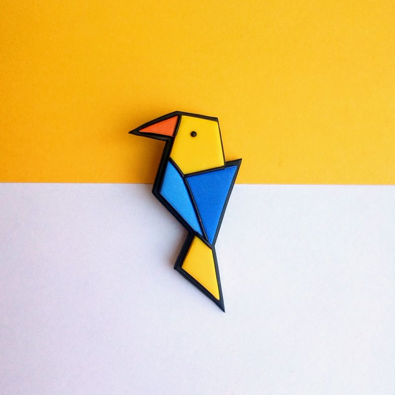 Origami style bird brooch. A perfect accessory for Your coat, hat, a lovely cardigan or even for Your backpack. Formed of strict geometric shapes this brooch will be a bright still minimalistic accent of Your outfit. If You love origami, this piece of jewelry is just for You. Just dare to be noticed! Specification of the brooch: - 100% handmade; - materials used: polymer clay, metal findings; - measurements: total length of the brooch ~6.4 cm (~2.5 in.), width at a widest point ~3.1 cm (~1.2 in.); - colour tones: black, yellow, light blue, blue, orange. The colors can slightly differ from the photo because of photography lighting and monitor settings; - the brooch has a nice matte look.