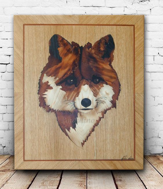 Original red Wooden cute fox animal art marquetry woodwork by Andulino