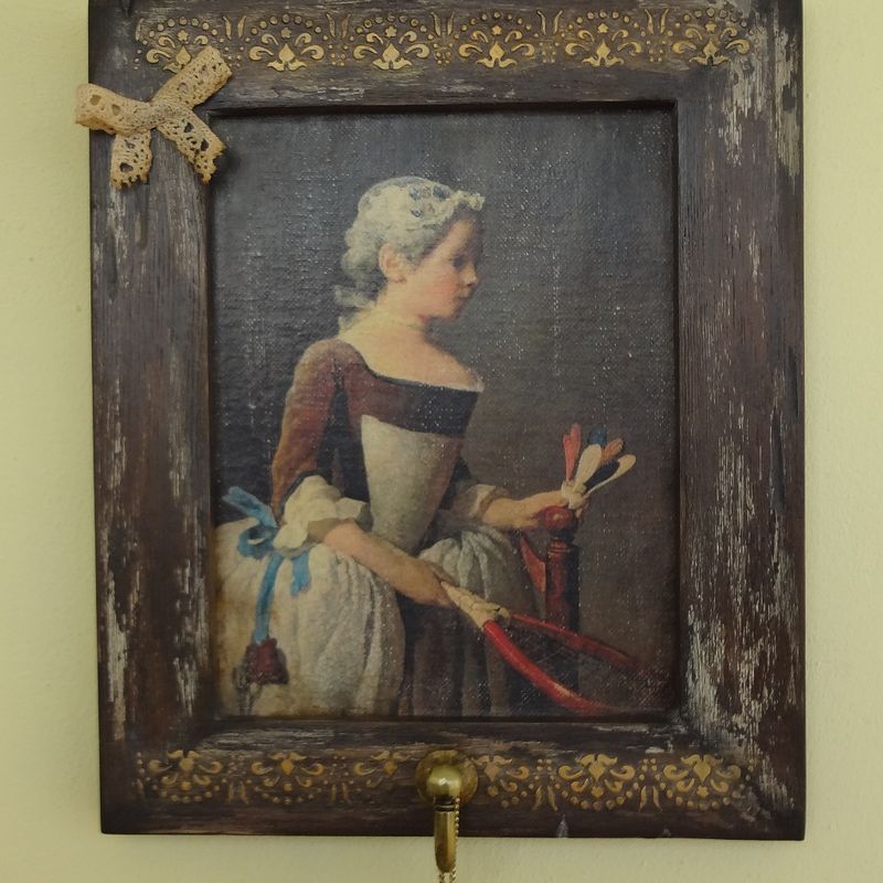 Once upon a time, long ago, a moment of a girls' joy who can not wait to play with her friends was captured... Appreciate every moment of your life! A panel key holder "Girl with a flounce" is unusual and interesting accessory for your hallway. It will also perfectly fit into the interior of the living room. The painting "The girl with a flounce" of a French painter Jean Simeon Chardin has inspired us for this key holder. The panel is very, very old ... A decorative panel made of of pine was aged by using multilayer staining, colouring, patination. It is decorated in decoupage technique with the use of bulk items. There are wall hangers on the metal rear. A decorative heart-shaped charm is a part of the panel. This original panel can be given to women, friends. The size is 25x30 cm. Care instructions: moderate wet treatment.