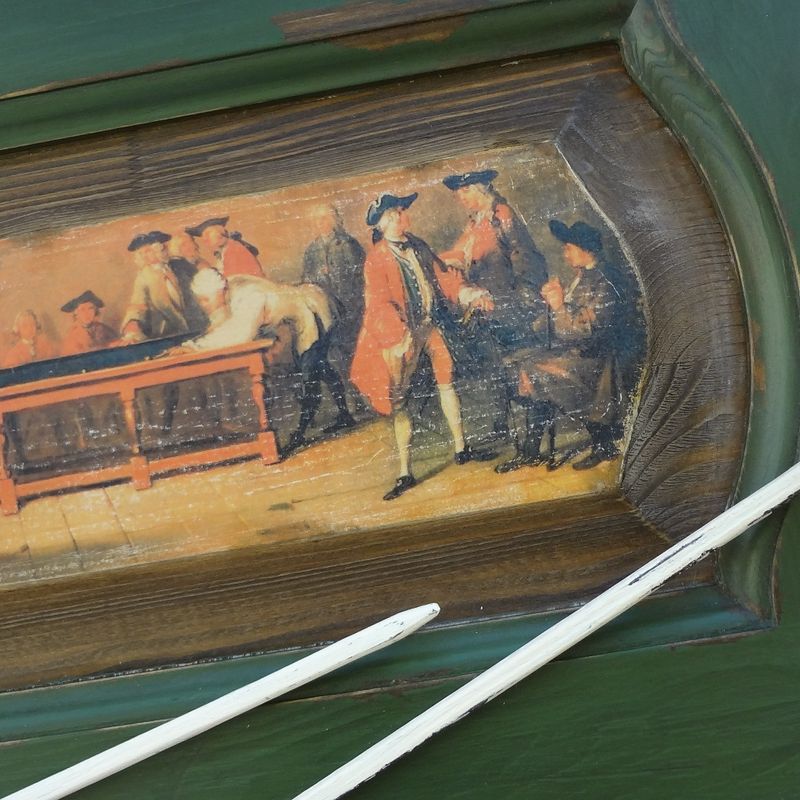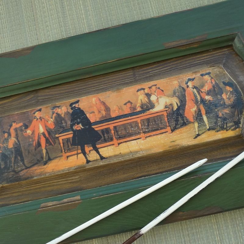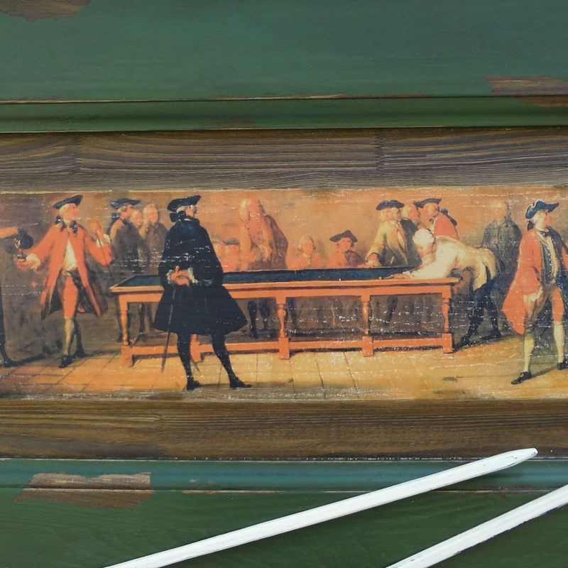 A panel "Playing the billiards" is an unusual and interesting decoration for your billiard room or office. We were inspired by the painting "Playing the billiards" of a French painter Jean Simeon Chardin. A panel looks shabby, with a touch of dust. A decorative panel made of of pine was aged by using multilayer staining, colouring, patination. It is decorated in decoupage technique with the use of bulk items imitating a billiard ball and cue sticks. The color and the shape of the panel mimics a billiard table. There are wall hangers on the metal rear. This original panel can be given to men, women, or friends. The size is 29x57 cm. Care instructions: moderate wet treatment.