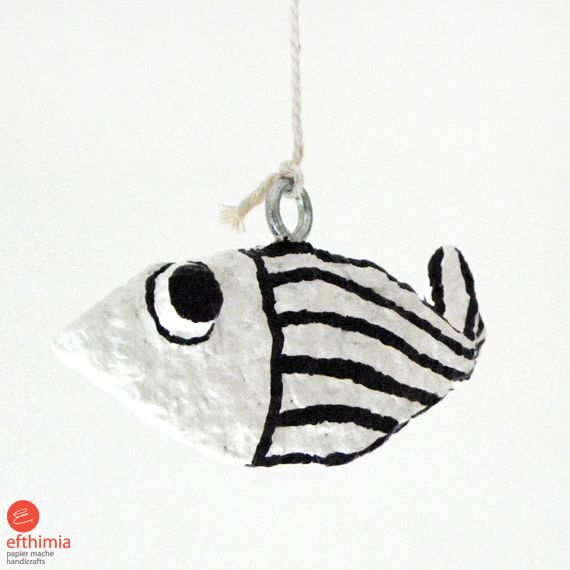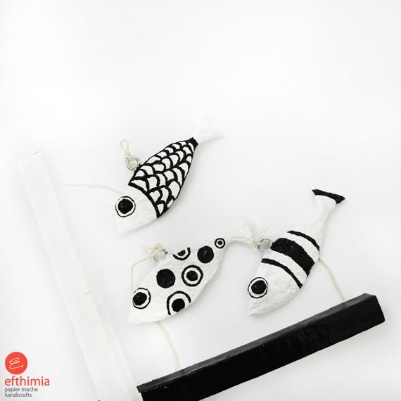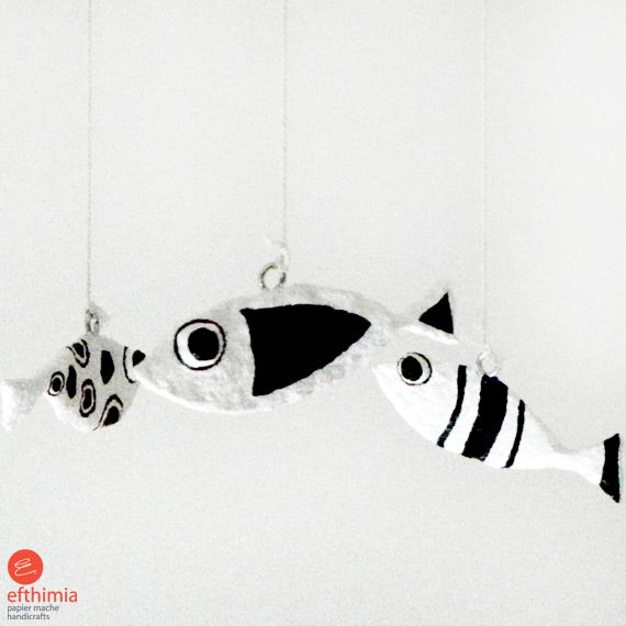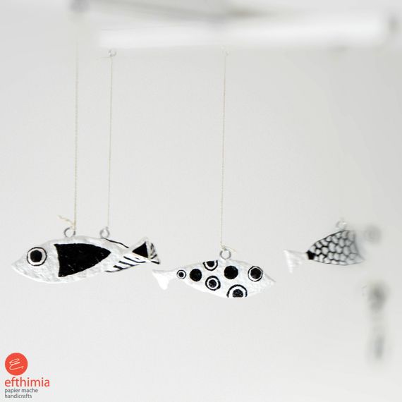 A unique handmade paper mache black and white fish mobile which you can hang on the ceiling. I made it from recycled materials: cardboard, newspaper and handmade paper pulp. I painted with acrylic colors and finally sealed it with glossy varnish for protection. A special gift to decorate your kid's room or a nursery room.