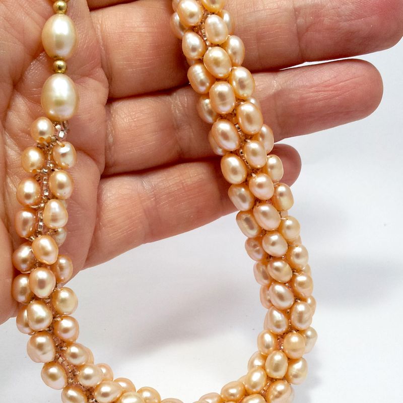 Awesome Pearl necklace are crocheted by me with A Quality fresh water pearls and tiny Czech seed beads. A lot of love and work in these piece! Each pearl and several seed beads is hand selected, hang strung, and hand crochet by me onto strong thread . One of a kind necklace is perfect for your special day or for all occasions! This necklace is crochet onto durable nylon thread. The necklace is approximately 17" long and finished with Gold filled 14k toggle claps.