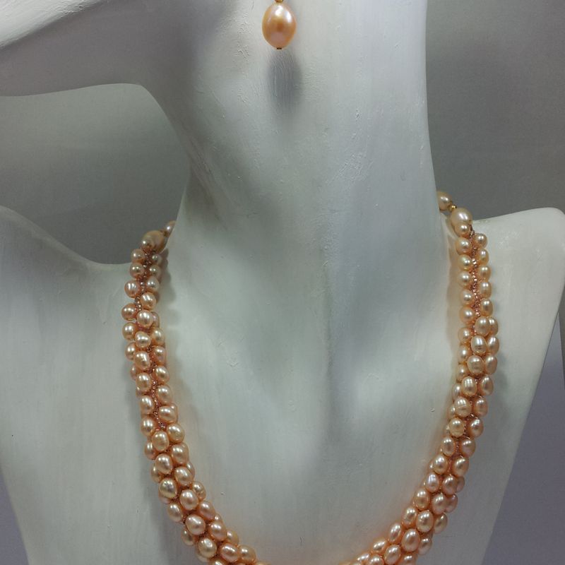 Peach Rose Fresh Water Pearls & Czech Seed Beads Unique Crochet Necklace & Earrings SET on Gold Filled 14k