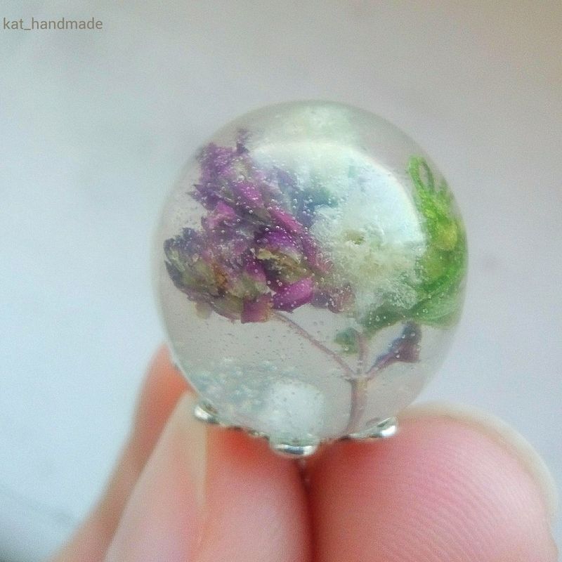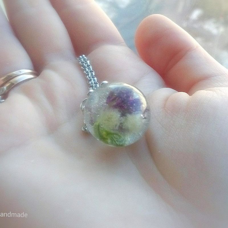 A delicate pendant with a piece of dry flowers inside. Sphere diameter 2cm, metal finishing, chainlet length 45cm, carabine lock.