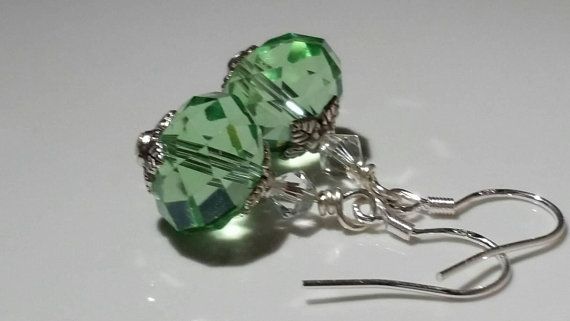 These elegant green earrings sparkle and shine. Topped with antique silver and crystal clear bicone. They are about 12mm in size and dangle about and inch and half from sterling silver ear hooks. They can be dressed up for formal wear or made casual for a fun and playful look. A great gift or treat for yourself. Included is an environment friendly earring card and decorative kraft bag sealed with my shop logo label. Check out my other items: www.jewelrybyginamonique.etsy.com https://www.etsy.com/listing/602153177/peridot-green-glass-earrings-green?ref=shop_home_active_5 Like me on Facebook: https://www.facebook.com/jewelrybyginamonique/