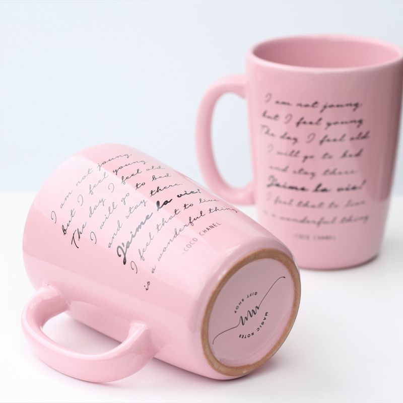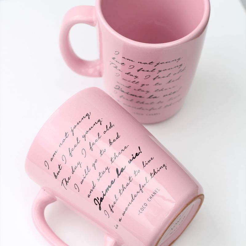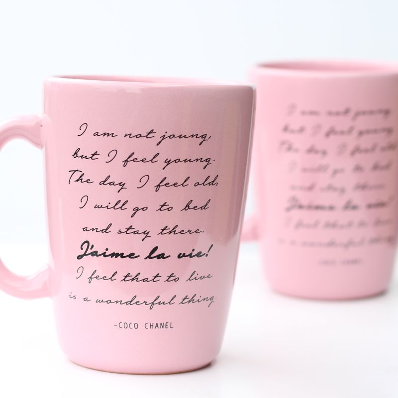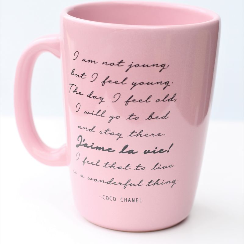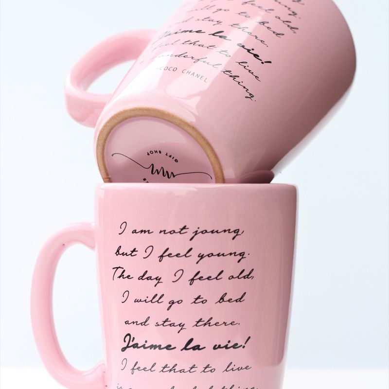 Beautiful pastel pink Coco Chanel quote mug will be the perfect gift for yourself or someone who loves to inspire himself during the coffee break. Coco Chanel inspired a lot of women in the world with her visdom quotes. And one of them I created on my mugs: "I am not young, but I feel young. The day I feel old, I will go to bed and stay there. J'aime la vie! I feel that to live is a wonderful thing." - Handmade in Latvia - Color: pastel pink - Capacity: 300ml (10 oz) - Material: high quality ceramic from Latvia - Dishwashersafe and microwavable - Limited quantity - Decal print