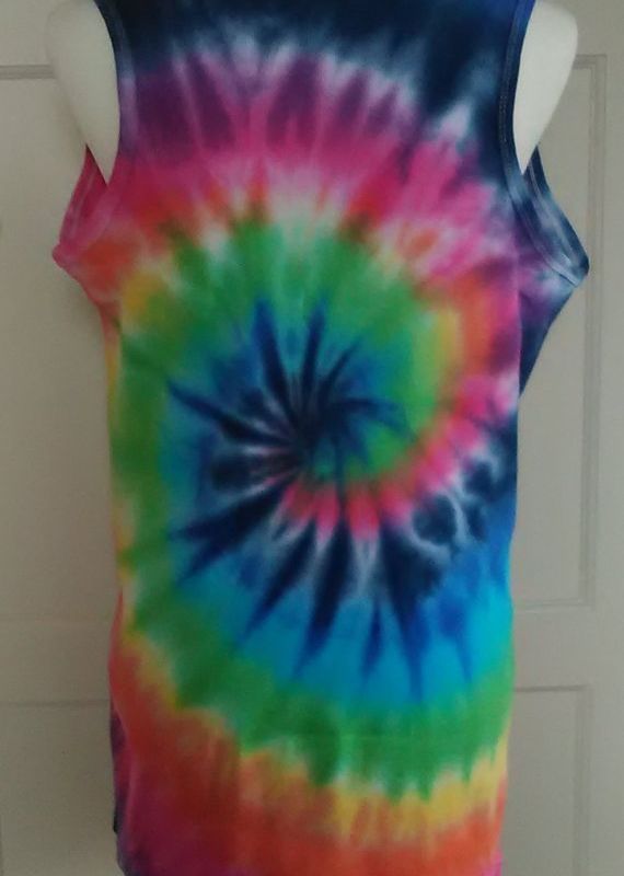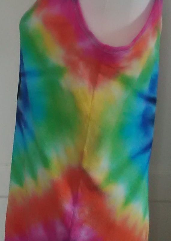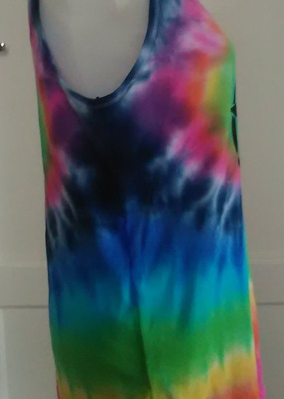 This little beauty came about because I was approached by a very lovely lady asking for this specific design. When I'd finished and put it on the dummy, I had a EUREKA! moment and decided that I want to make more! The mannequin wears a size 26 as per the customer's request,however, as soon as I make one for myself I will update the pictures. I use a Slouch Fit vest rather than a Stretch Fit as it is more comfortable, the fabric is softer and it also allows more give around the bust, underarm and hem areas if you're not a 'typical size X' Item link ; https://www.etsy.com/uk/listing/602310127/rainbow-tie-dye-vest-top-pentagram