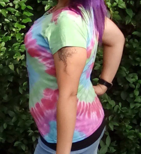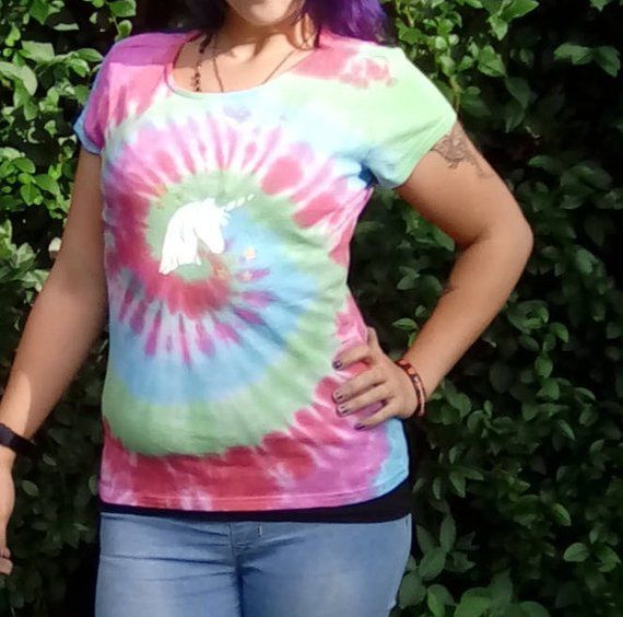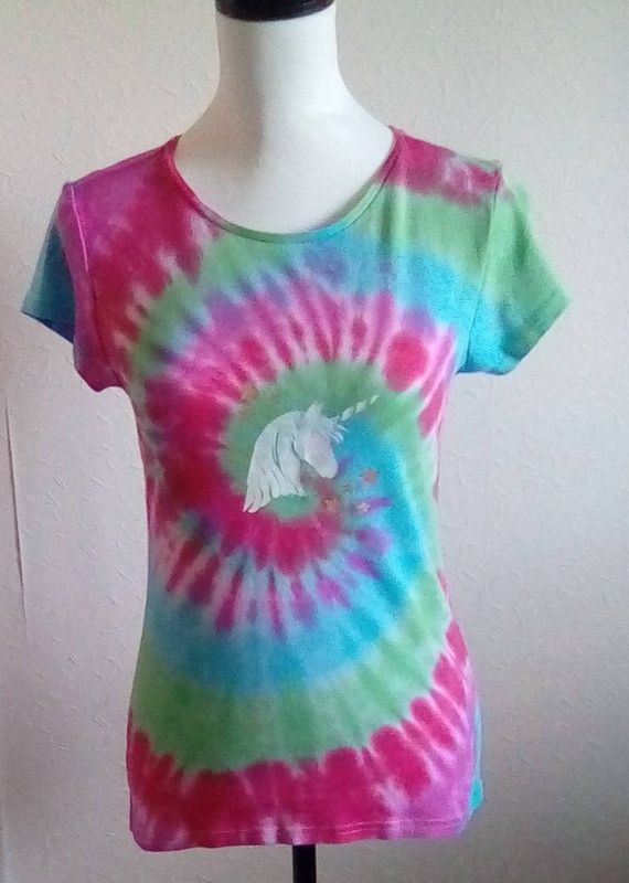 Swirled tie dye in red, green, blue and pink with a white unicorn stencil and gold stars. Model wears a UK size 12. Item link; https://www.etsy.com/uk/listing/538869943/rainbow-unicorn-tie-dye-t-shirt-tie-dye
