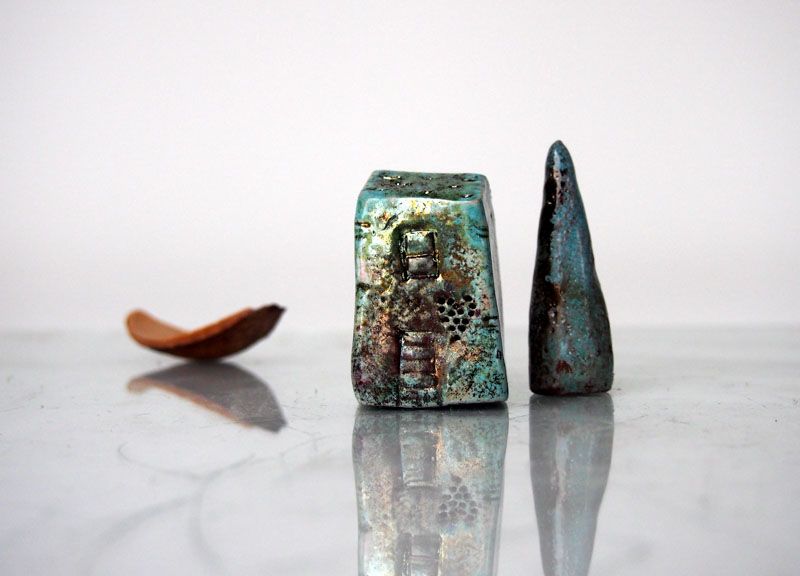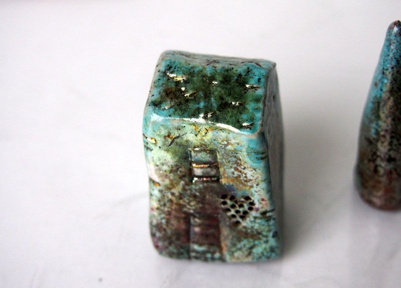 Black Ceramic raku art buildings with copper details